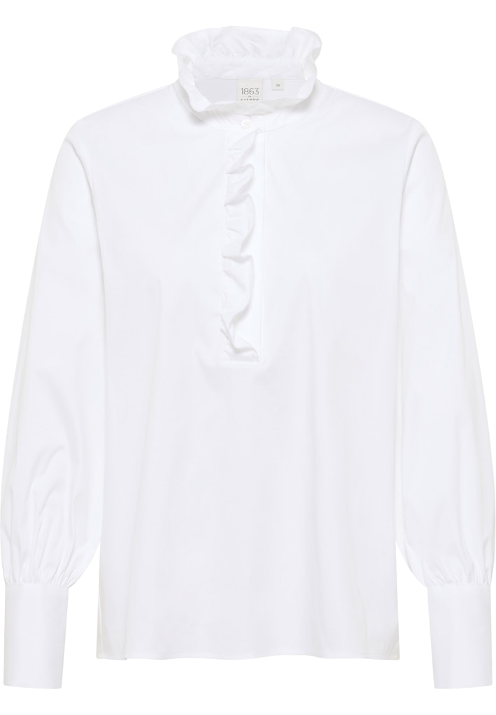 Der Rüschen-Stehkragen und der Rüschenbesatz sind absolute Eyecatcher und machen die Bluse zu etwas ganz Besonderem.