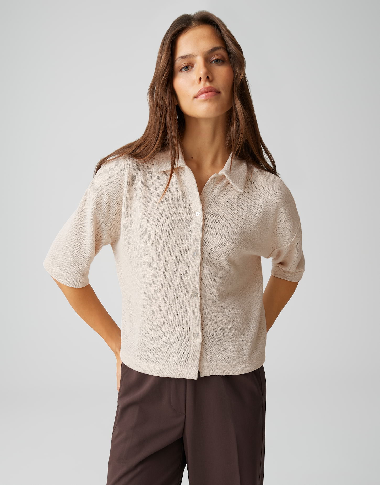 lockere Passform, gerader Schnitt, verkürzte Länge, überschnittene Schulter mit Kurzarm, Polokragen, Rückenlänge ca. 52 cm bei Größe 36, Model Größe 177 cm - trägt Größe 36, Jersey, Strick Optik, natürlicher Griff, leichte Transparenz im hellen Farbton, Kellerfalte im Rücken, Knopfleiste