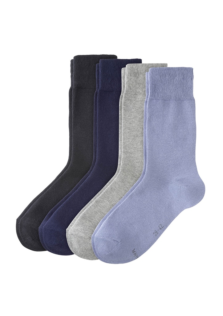 vier Paar super angenehm zu tragende Socken, Packung mit unterschiedlichen Farbkombinationen, breites, nicht einschneidendes Bündchen, ohne drückende Nähte, formbeständig und rutscht nicht, hochwertige, angenehm zu tragende Materialmischung mit hohem Baumwollanteil