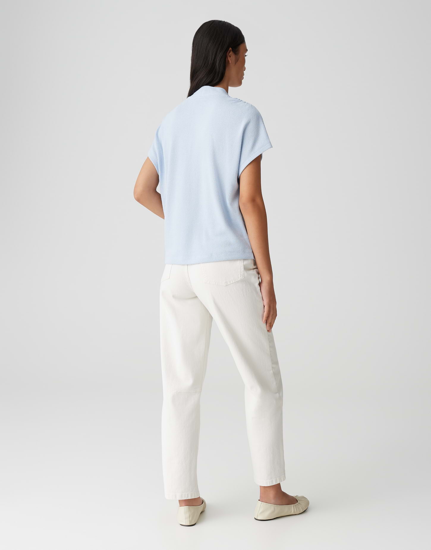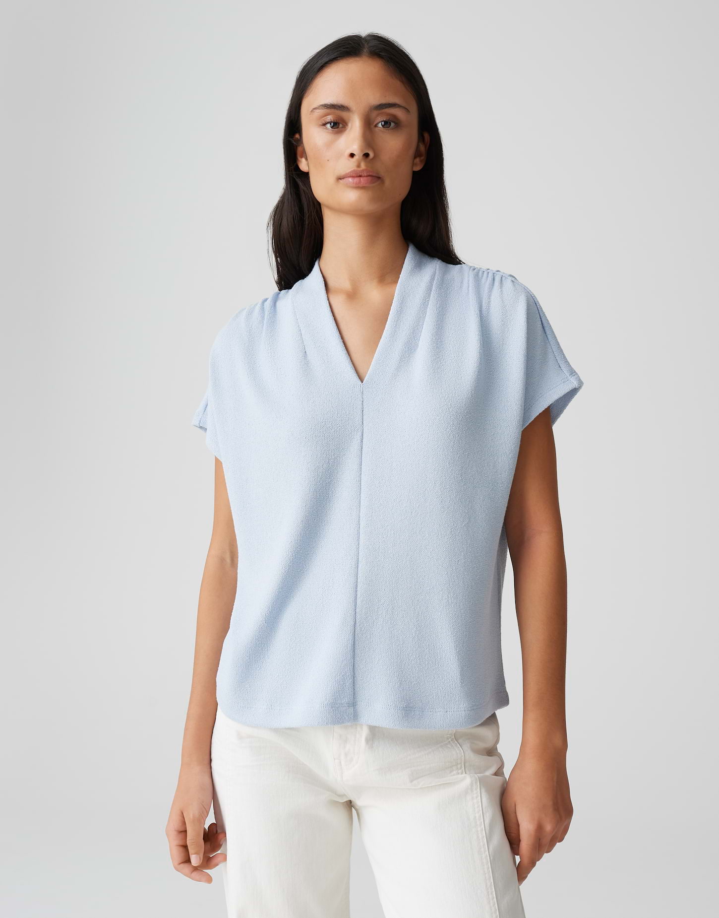 lockere Passform, gerader Schnitt, normale Länge, überschnittener Kurzarm, V-Ausschnitt, Rückenlänge ca. 56 cm bei Größe 36, Model Größe 178 cm - trägt Größe 36, Jersey, Strick Optik, natürlicher Griff, fließender Fall, Drapierung in der Schulter, Teilungsnaht vorn