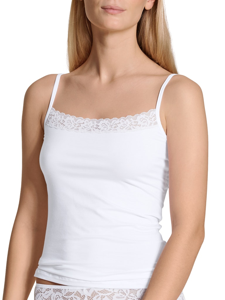 Spaghetti-Top|duftig-feminines Design|Träger verstellbar|Spitze am hohen Ausschnitt|klassische Farbauswahl|körpernaher Schnitt|hochwertige Supima®-Baumwolle|glatte Single Jersey-Qualität