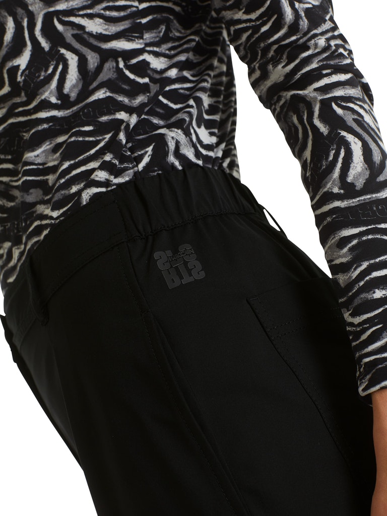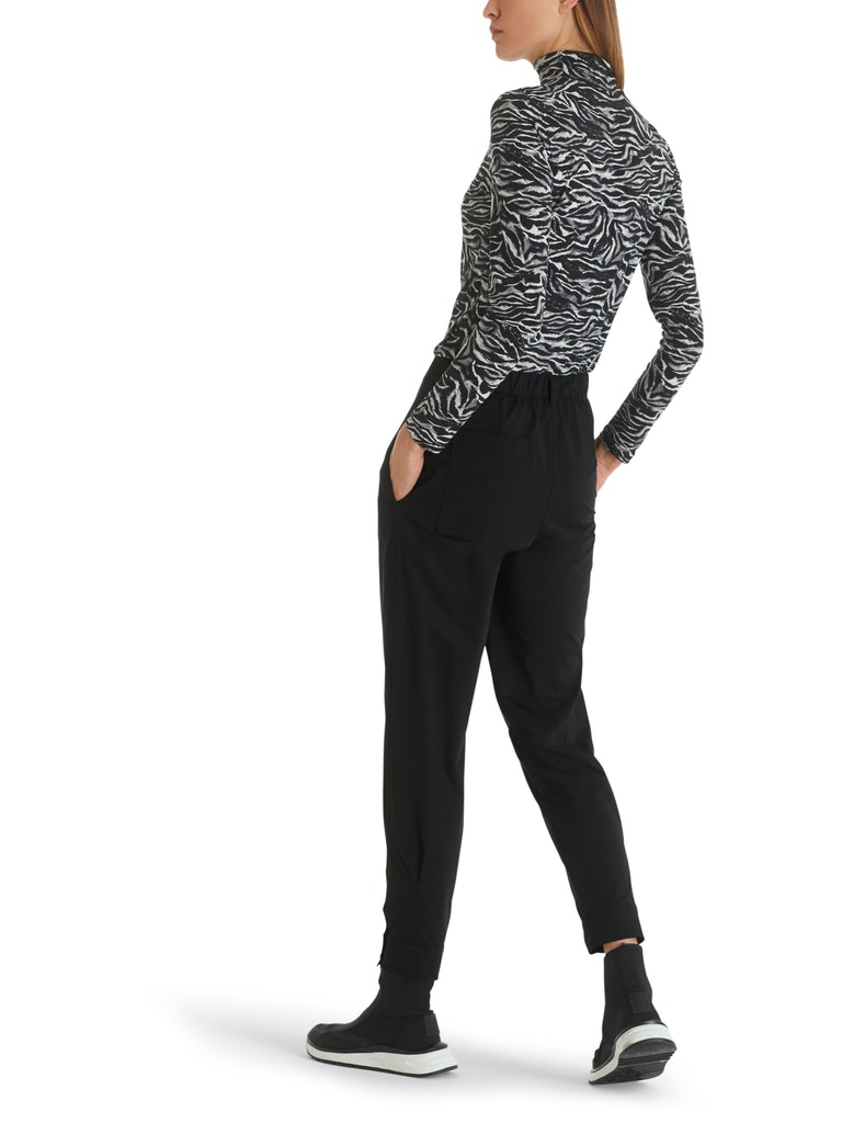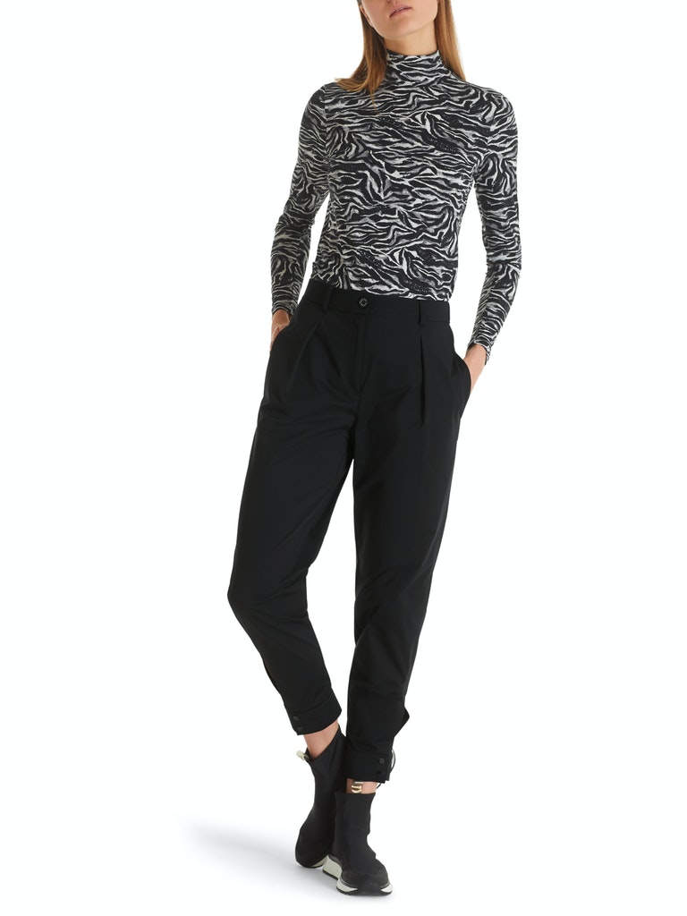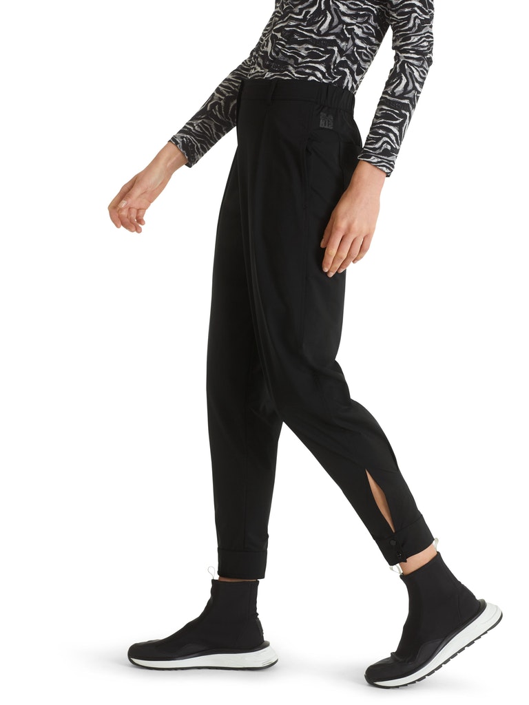 Sportive Hose|Die sportive Hose ist aus leichter Mikrofaser gefertigt. Die lässigen Bundfalten untermalen den coolen Look. Die Beinabschlüsse sind mit Druckknopfdetails ausgestattet. Zwei seitliche Eingrifftaschen und eine zusätzliche Gesäßtasche ergänzen den Style.|Farbe: black|Konische Form|Made in Europe|Das Model ist 179 cm groß und trägt N3/38.|Mit Logo-Knopf und Reißverschluss