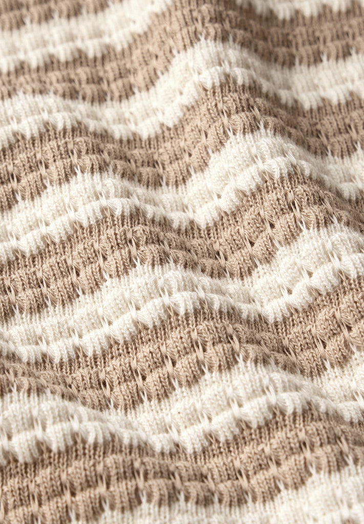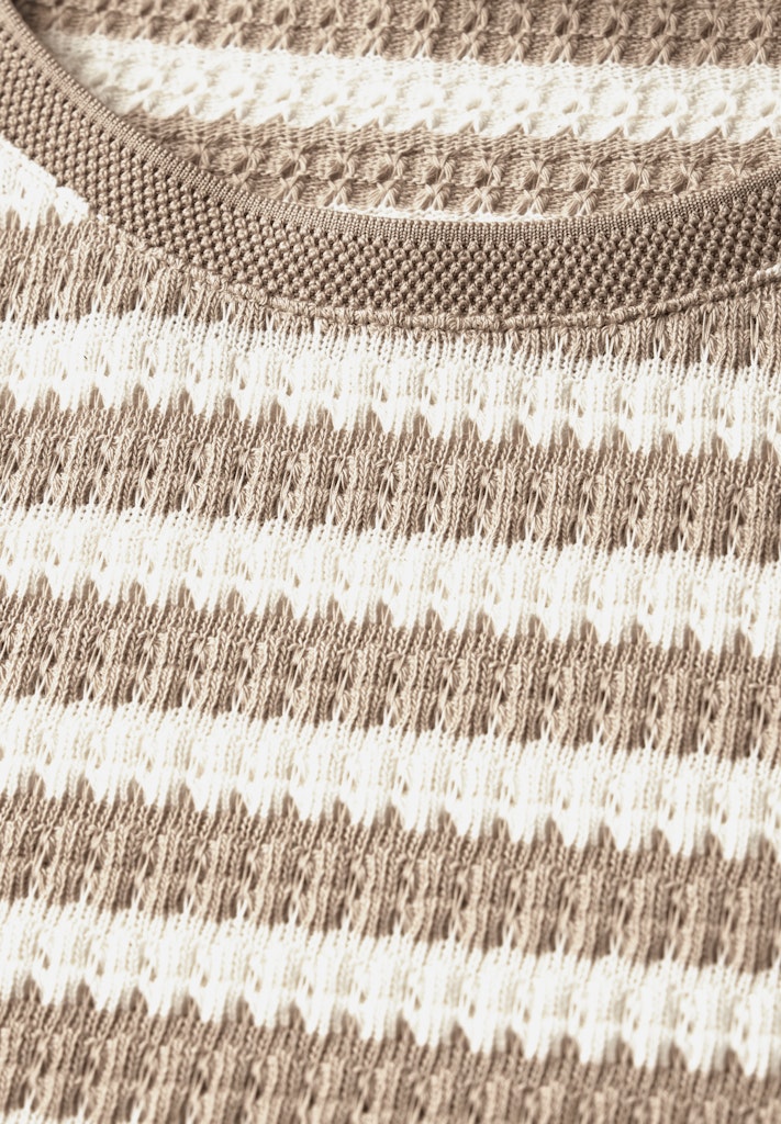 Das Streifenshirt im Strick-Look von Street One für Damen hat einen Rundhalsausschnitt und kurze Ärmel. Die Strick-Optik macht das T-Shirt zum modischen Hingucker, während der softe Baumwollmix es besonders gemütlich macht. Ideal für entspannte Casual-Looks. Kurzarmshirt Rundhalsausschnitt Seitliche Schlitze im Saum Streifenmuster Softer Baumwollmix Material: 65% Baumwolle, 35% Polyester