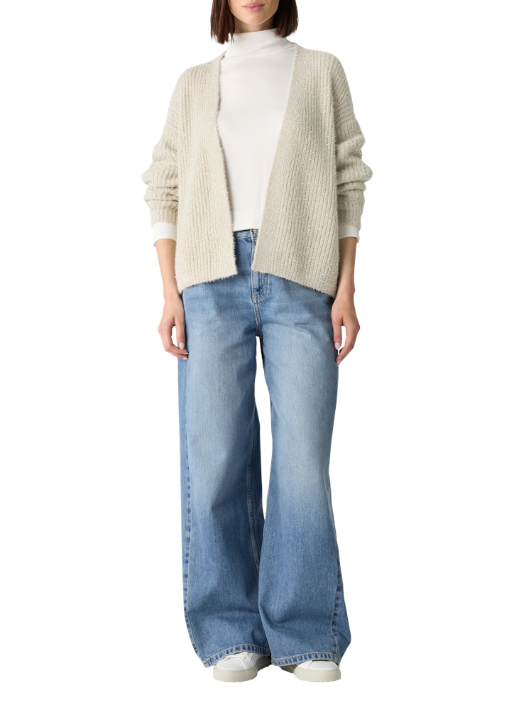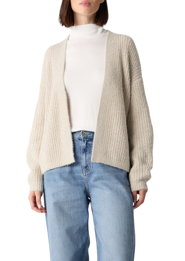 Glamourös und gemütlich zugleich: Diese Strickjacke im Relaxed Fit verzaubert mit schimmerndem Glitzergarn und weichem Baumwollmix. Der V-Ausschnitt und die voluminösen Ballonärmel mit Rippbündchen setzen feminine Akzente, während die überschnittenen Schultern einen lässigen Touch verleihen. Ein elastischer Allrounder, der Ihrem Outfit mühelos einen eleganten Glitzer-Twist verleiht.