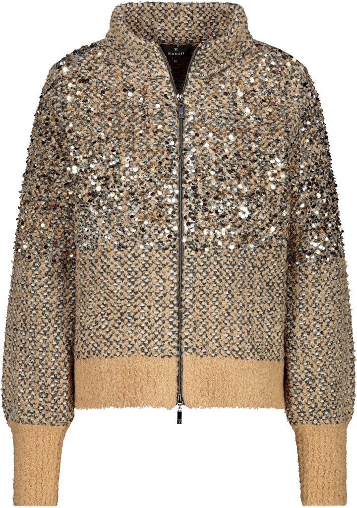 Entdecken Sie die stilvolle Strickjacke mit schimmernden Pailletten, gefertigt aus einer hochwertigen Baumwollmischung in einer eleganten Tweed-Struktur.