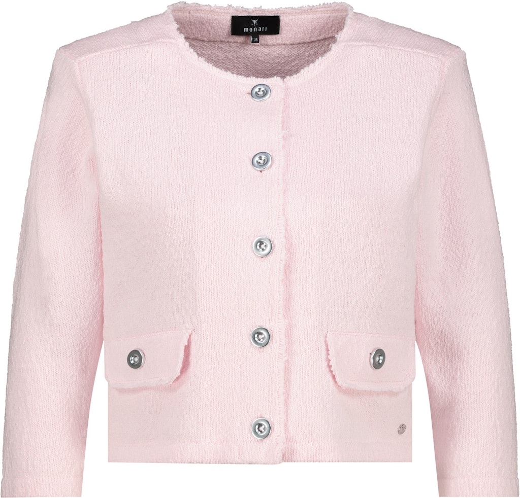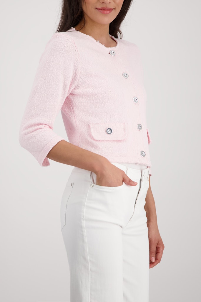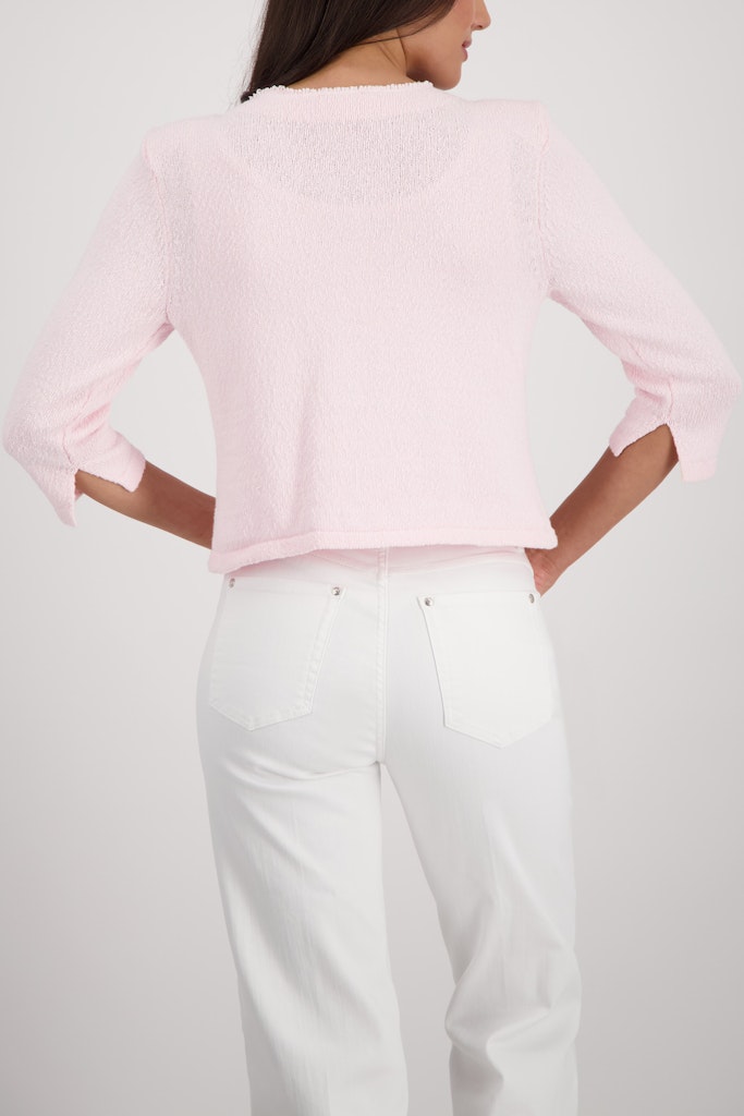 Diese Strickjacke mit Flammgarn besteht zu 100% aus Baumwolle und hat ¾-Ärmel mit Schlitzen.