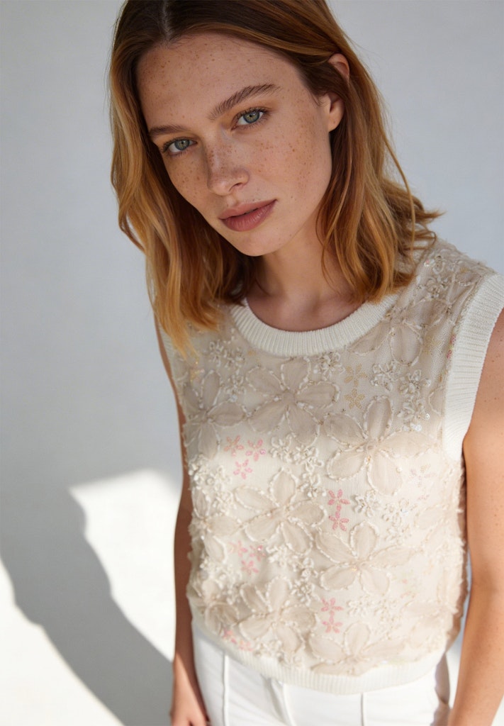 Diese ärmellose Stricktop von MORE & MORE bringt frischen Style in Ihren Look. Der softe Strick in zartem Creme sorgt für ein angenehmes Tragegefühl, während die aufwendig bestickte Front mit floralen Details und Pailletten einen eleganten Eyecatcher setzt. Ein echtes Lieblingsstück für alle, die romantische Details mit modernem Chic kombinieren möchten.