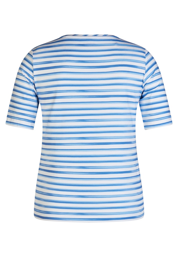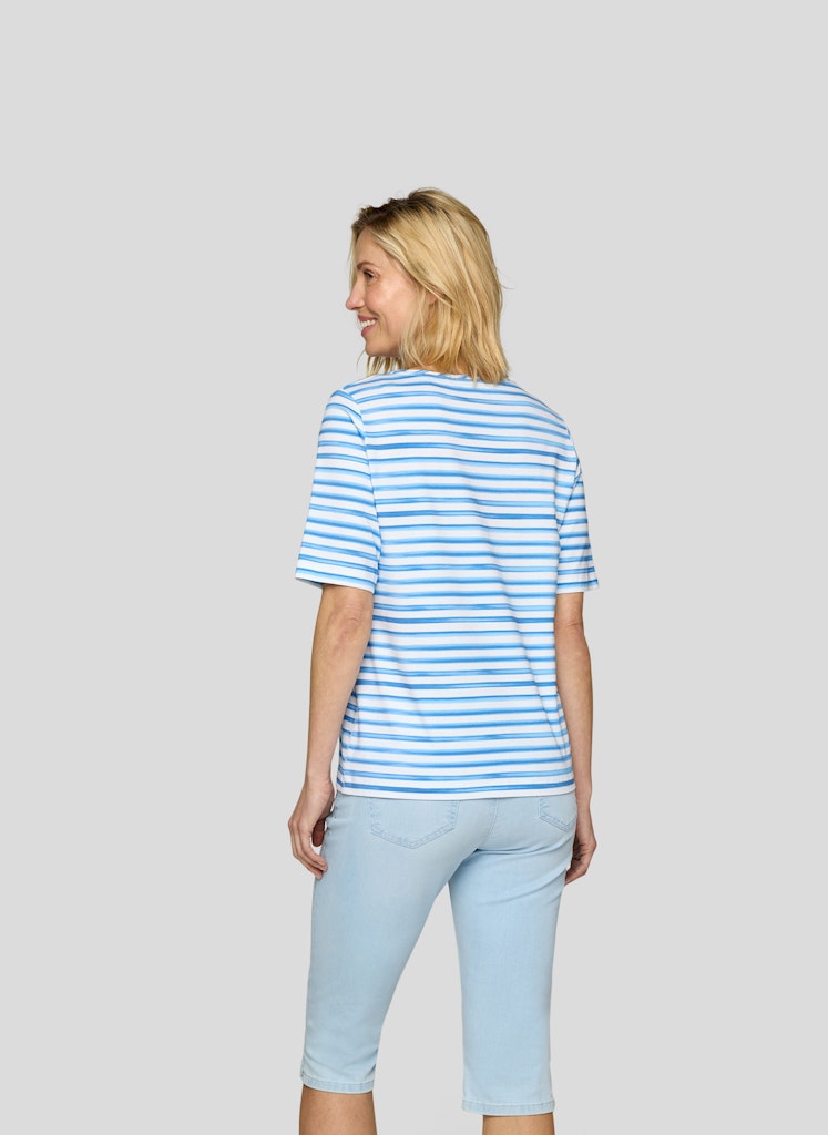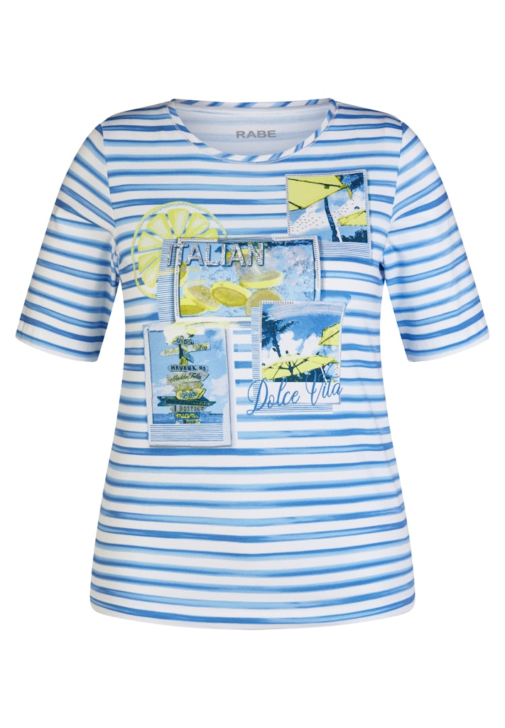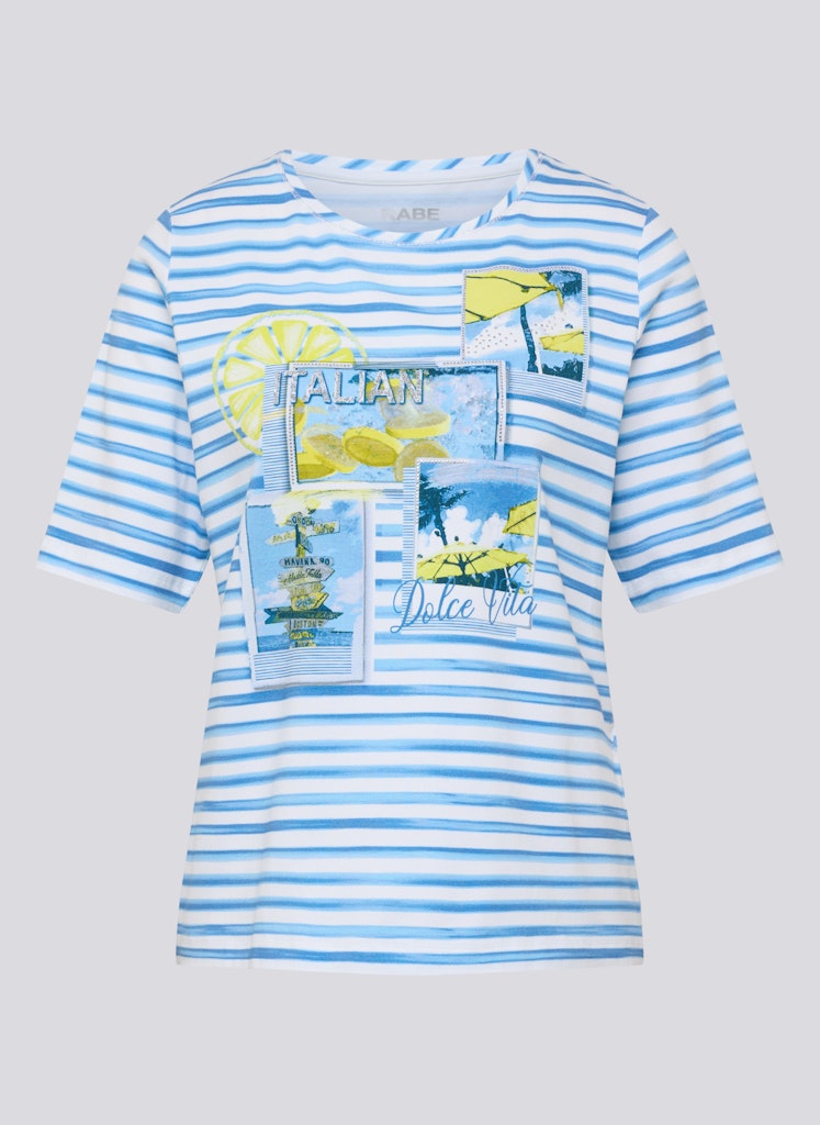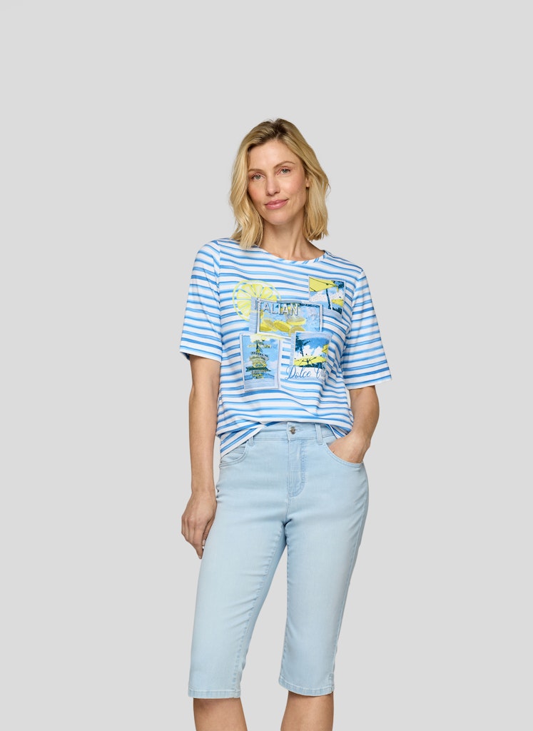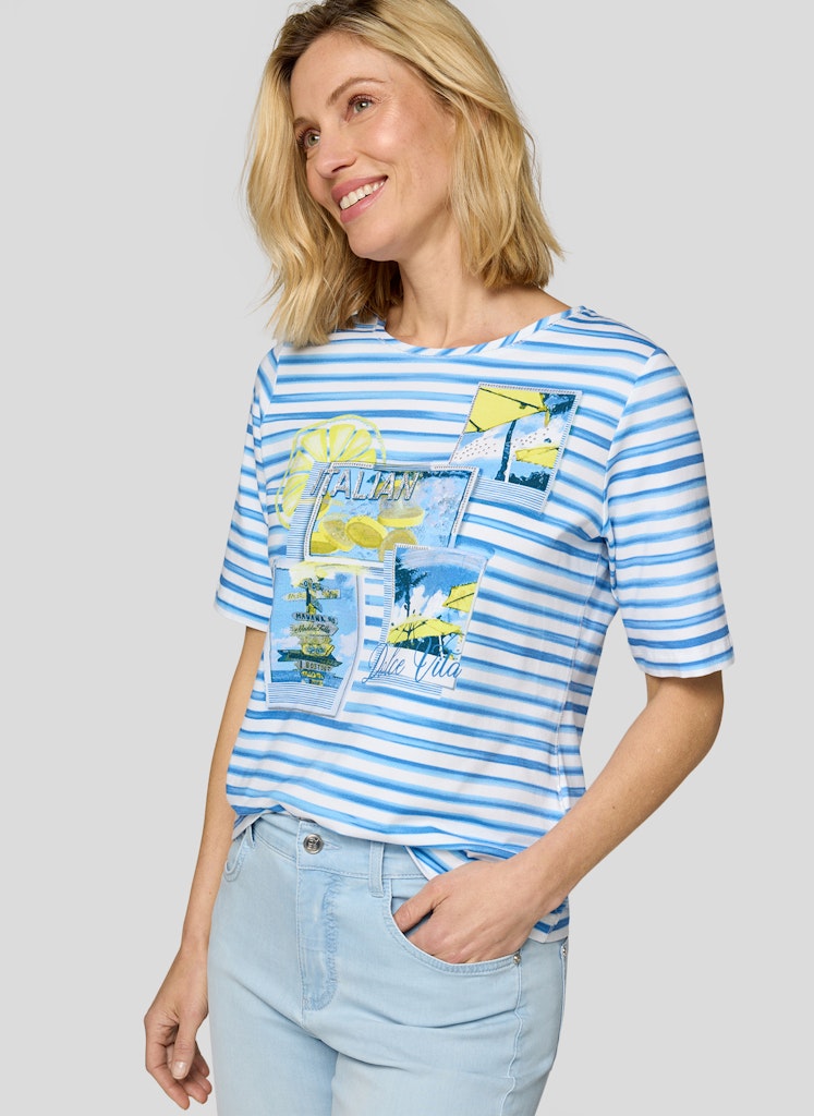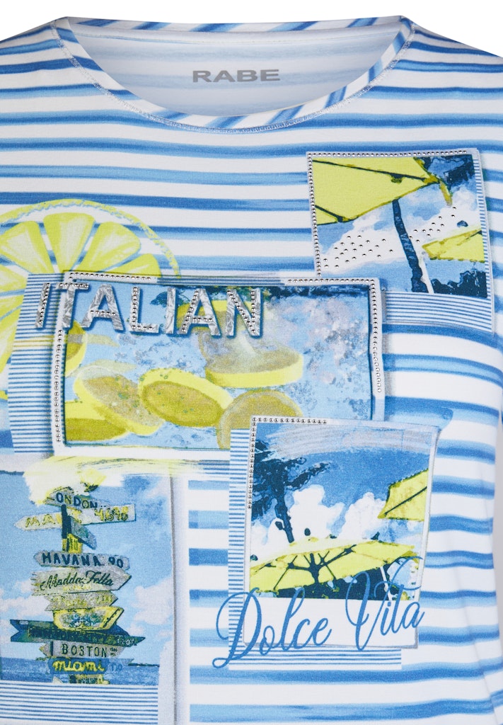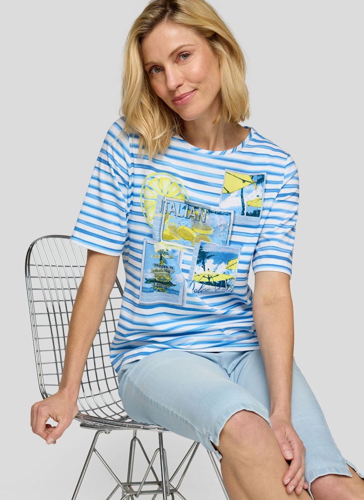 Dieses Shirt ist eine modische Hommage an das süße Leben. Die Kombination aus frischen Streifen, dekorativen Fotoprints und dem verspielten _Dolce Vita_-Schriftzug sorgt für einen lässigen, sommerlichen Look mit italienischem Charme.Allover-Streifenmuster in maritimer Optik.Mehrere Fotoprints mit Urlaubsmotiven und Zitronenakzenten.Schriftzug _Dolce Vita_ als romantisches Detail.Rundhalsausschnitt und halblange Ärmel für bequemen Sitz.Weiche Jersey-Qualität mit angenehmem Tragegefühl.