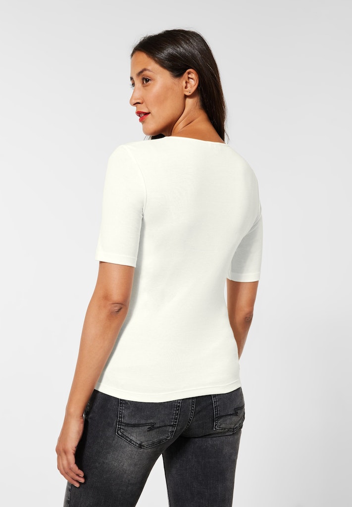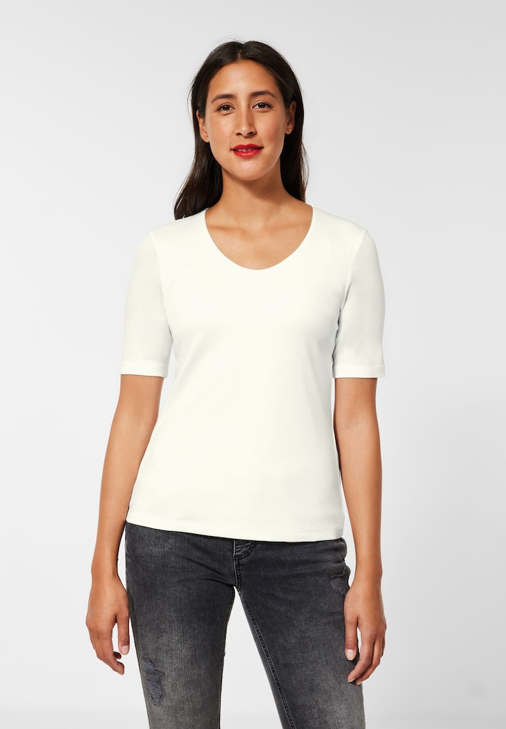 Basic geht immer! Frühlingsfrisch zeigt sich das Damen T-Shirt im neuen Style Palmira von Street One. Mit V-Ausschnitt und im Basic Style ist es ein Klassiker im Kleiderschrank. Die halben Ärmel ergänzen den Look.