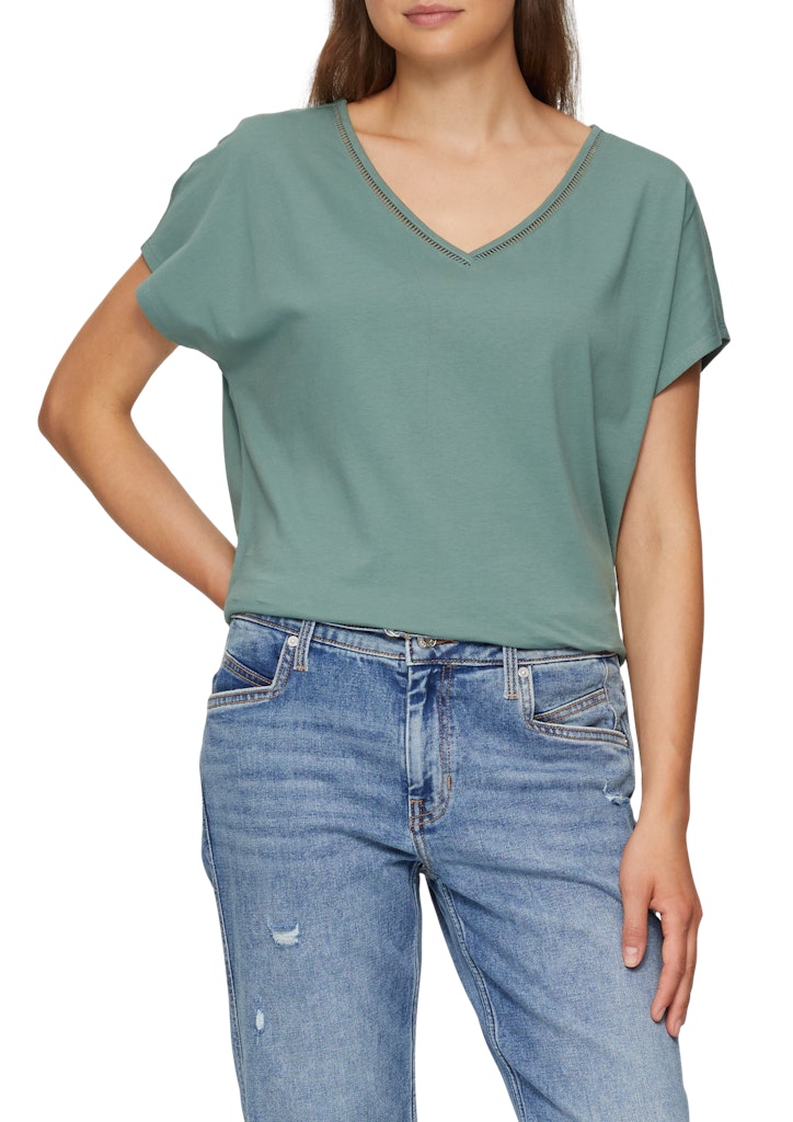 Entspanne dich in diesem luftig-leichten T-Shirt mit Stickerei-Akzent am V-Ausschnitt! Der Relaxed Fit aus reiner Baumwolle umschmeichelt deine Silhouette lässig und feminin. Lass dich von diesem vielseitigen Basic für Frühjahr und Sommer begeistern - kombiniere es mit Jeans, Shorts oder Röcken für einen unkomplizierten Look voller Leichtigkeit.