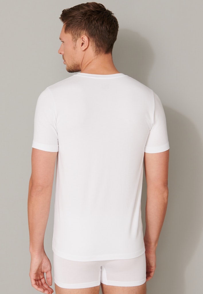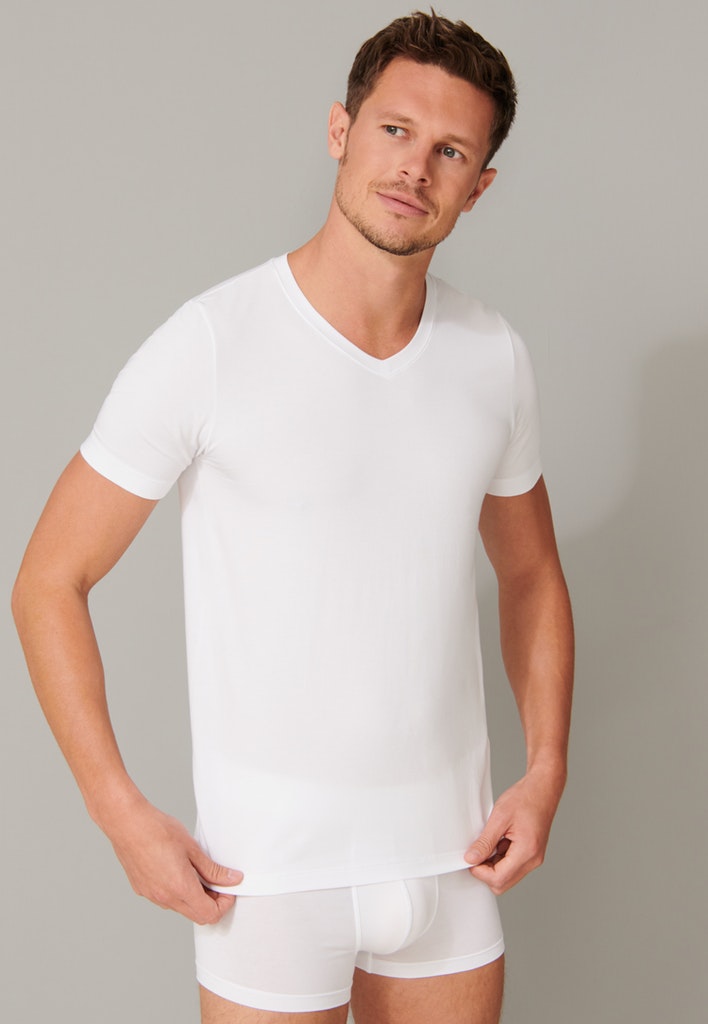 Dieses weiße T-Shirt aus der SCHIESSER-Serie "Long Life Soft" ist genau das Richtige für Herren, die innovatives, pillingarmes Material in perfekter Passform schätzen. Hochwertiger, elastischer Single Jersey fühlt sich dabei angenehm glatt und weich an auf der Haut und sorgt mit dem ausgeglichenen Micromodal-Anteil für ein optimales Feuchtigkeitsmanagement. Ein besonders langlebiges Shirt mit V-Neck, das sich sanft jeder Bewegung des Körpers anpasst und dadurch höchsten Tragekomfort gewährt.