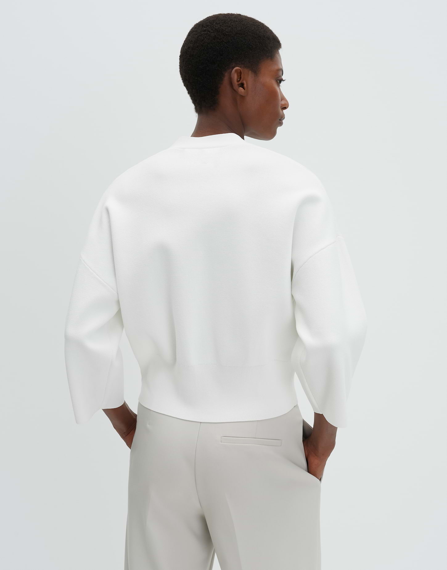 lockere Passform, schmal zulaufend, verkürzte Länge, überschnittene Schulter mit 3/4 Arm, V-Ausschnitt, Rückenlänge ca. 52 cm bei Größe 36, Model Größe 176 cm - trägt Größe 36, Strick, glatter Griff, formstabil, breite Strickbündchen, Knopfleiste