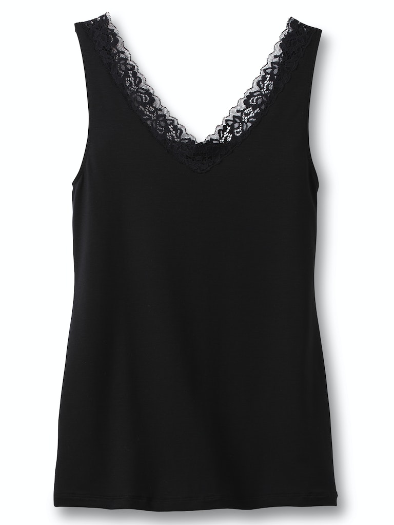 ärmelloses Top|duftige Spitzendetails|mittelhoher V-Ausschnitt|körpernaher Sitz|hochwertige Supima®-Baumwolle|glatte Single Jersey-Qualität
