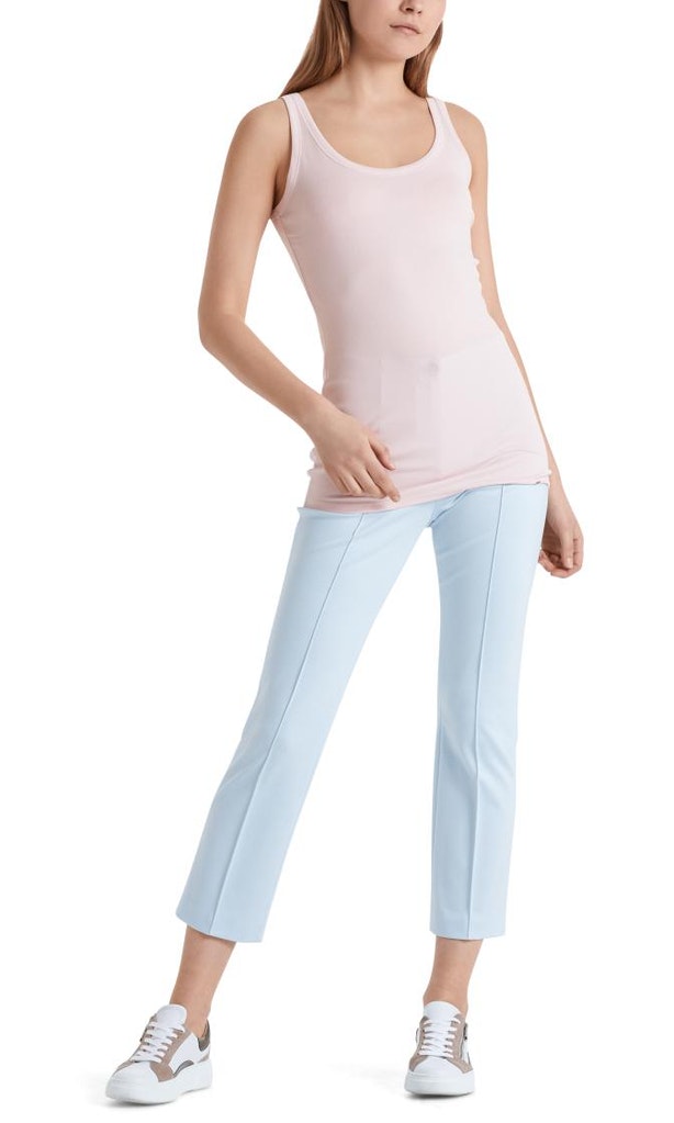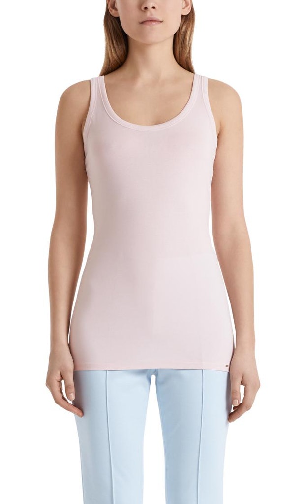 Tanktop aus Baumwoll-Mix|Das dezent taillierte Tanktop ist dank der leichten Baumwoll-Elasthan Mischung mit softem Griff besonders angenehm zu tragen. Einfassungen mit Overlocknähten an den Ausschnitten und ein schmuckvoller Dekostein vorne über dem Saum runden das hochwertige Essential mit cleanem Design ab.|Farbe: light rose|Elastisches Baumwoll-Gemisch|Leicht tailliert, Rundhals-Ausschnitt|Das Model ist 179 cm groß und trägt N3/38.|Schimmernder Marc Cain Logo-Print innen an der Nackenpartie