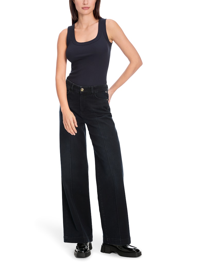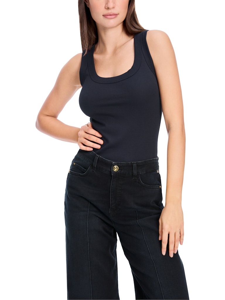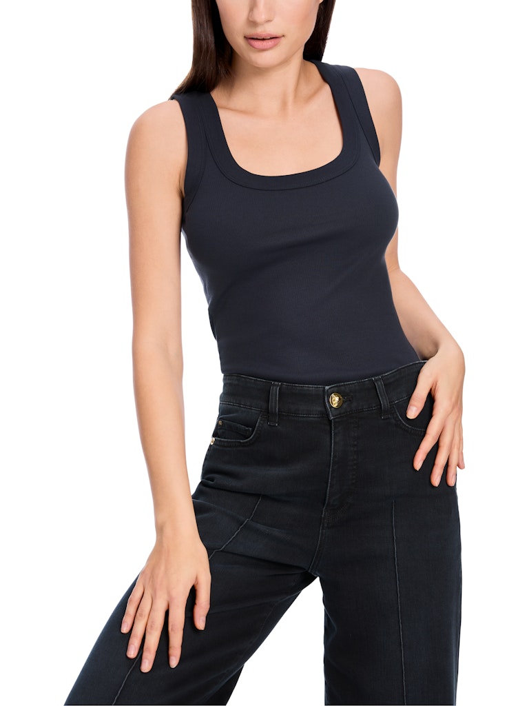 Tanktop aus Feinripp|Cleanes Tanktop aus Baumwolle mit angenehmem Elasthananteil und Rundhals-Ausschnitt von Marc Cain. Die taillierte Silhouette vereint sich bei dem legeren Basic-Teil mit feinstem Ripp-Dessin. Ein entspanntes Must-Have, das jede Garderobe nonchalant ergänzt.|Farbe: black|Elastischer Baumwoll-Mix|Tailliert geschnitten|Das Model ist 179 cm groß und trägt N3/38.|Schimmernder Marc Cain Logo-Print innen an der Nackenpartie