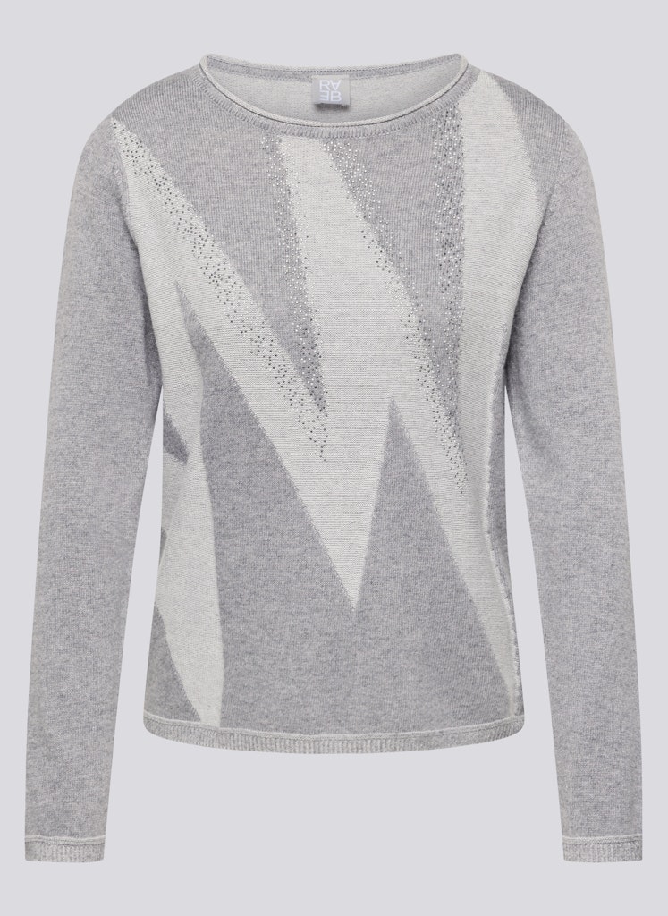 Dieser Pullover überzeugt mit seinem großflächigen, grafischen Intarsia-Muster in harmonischen Grautönen. Strasssteinchen setzen funkelnde Akzente und unterstreichen das abstrakte Motiv stilvoll. Der Rundhalsausschnitt ist fein eingefasst, die Verarbeitung aus Viskose-Mix mit Kaschmir-Anteil sorgt für ein angenehmes Tragegefühl. Ein femininer Eyecatcher mit modernem Look. Weiche Viskose-Kaschmir-Mischung. Strassdetails im Motiv integriert. Feines Jacquardmuster in Intarsia-Optik. Klassischer Rundhalsausschnitt. Gerader, bequemer Schnitt.