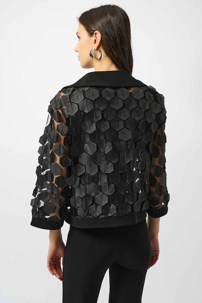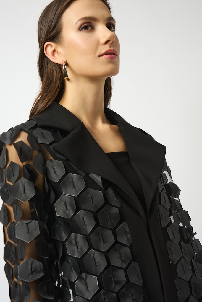 Zeigen Sie sich selbstbewusst mit dieser Jacke aus besticktem Mesh und feinem Jersey. Der dreidimensionale geometrische Print zieht alle Blicke auf sich, während die Trapez-Silhouette bei jeder Bewegung anmutig fließt. Die Dreiviertel-Glockenärmel und der Reverskragen verleihen diesem Kleidungsstück einen Hauch von Raffinesse und machen es zu einem perfekten Statement-Piece für Ihre Garderobe.