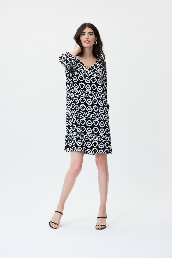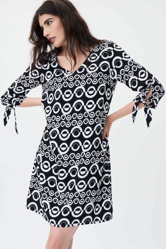 Das sommerliche entspannte Trapezkleid mit geometrischem Muster zeigt Bein und ist entspannt, aber verführerisch. Gefütterte Verarbeitung, V-Ausschnitt, Knotendetail am geschlitzten 3/4-Arm.