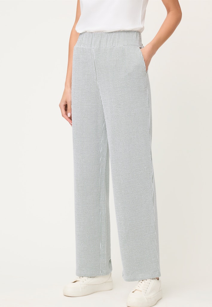 Luftige Leichtigkeit und modische Weite zeichnen diese Hose aus Seersucker-Qualität aus. Die charakteristische kreppartige Oberfläche mit vertikalen Streifen verleiht dem Modell eine besondere Struktur. Ein elastischer Bund und der komfortable Schnitt sorgen für hohen Tragekomfort, während der weite Beinverlauf eine moderne, figurumspielende Silhouette schafft. Länge ca. 29 Inch.