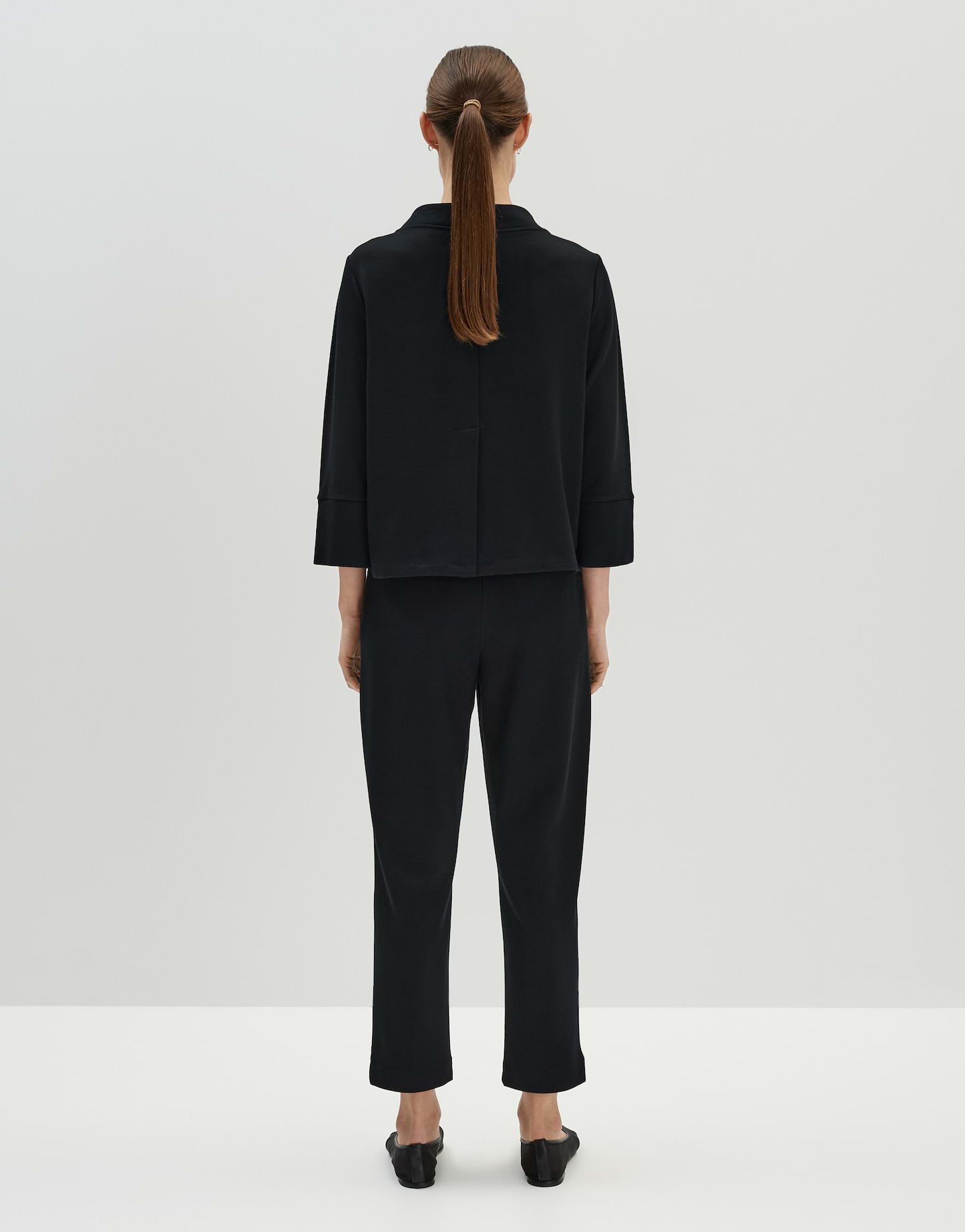 weite Passform, gerader Schnitt, normale Länge, 3/4 Arm, Stehkragen, Rückenlänge ca. 56 cm in Größe 36, Model Größe 176 cm - trägt Größe 36, Jersey, dezente Twillstruktur, weicher Griff, elastischer Stoff, Schlitz hinten, Schlitze im Ärmelbund, Längsnaht hinten, Freizeit Anlass