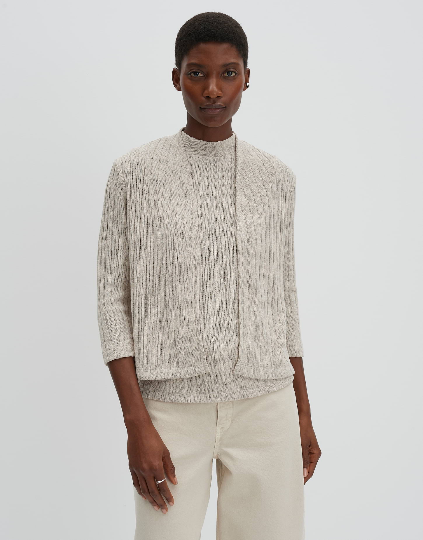 lockere Passform, gerader Schnitt, 3/4 Arm, Rückenlänge ca. 52 cm bei Größe 36, Model Größe 176 cm - trägt Größe 36, Jersey, Rippstruktur, weicher Griff, leichte Transparenz, offene Front, kleine Schlitze in den Seiten