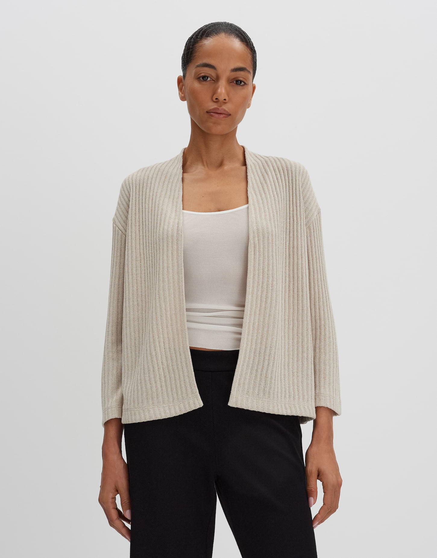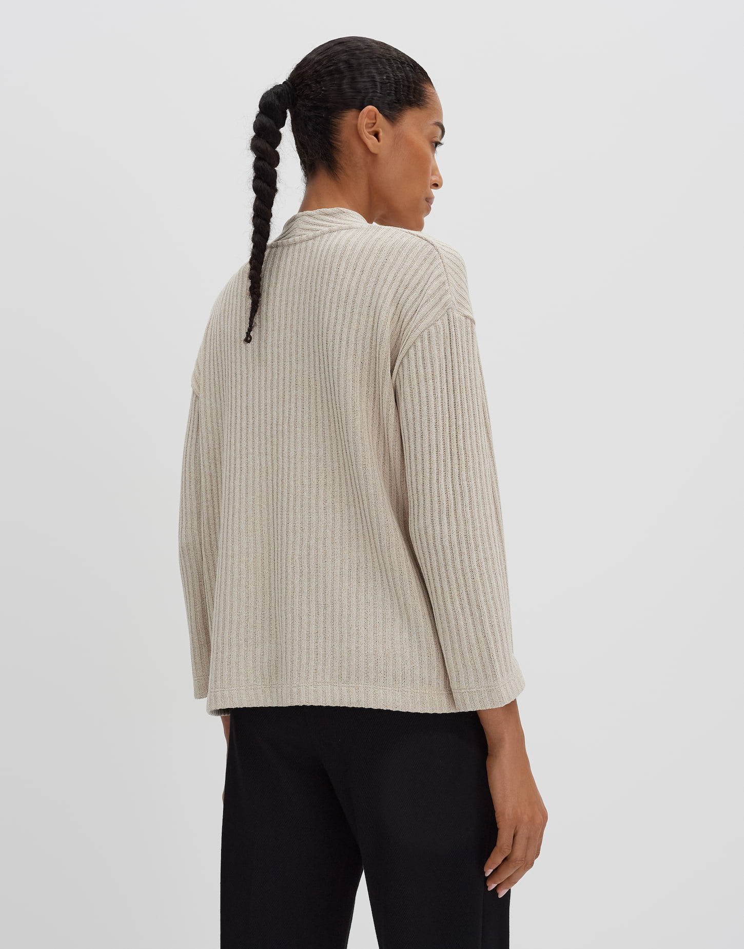 normale Passform, gerader Schnitt, leicht verkürzt geschnitten, überschnittene Schulter mit 3/4 Arm, Rückenlänge ca. 56 cm bei Größe 36, Model Größe 177 cm - trägt Größe 36, Jersey, feine Rippstruktur, kühler Griff, Strick Optik
