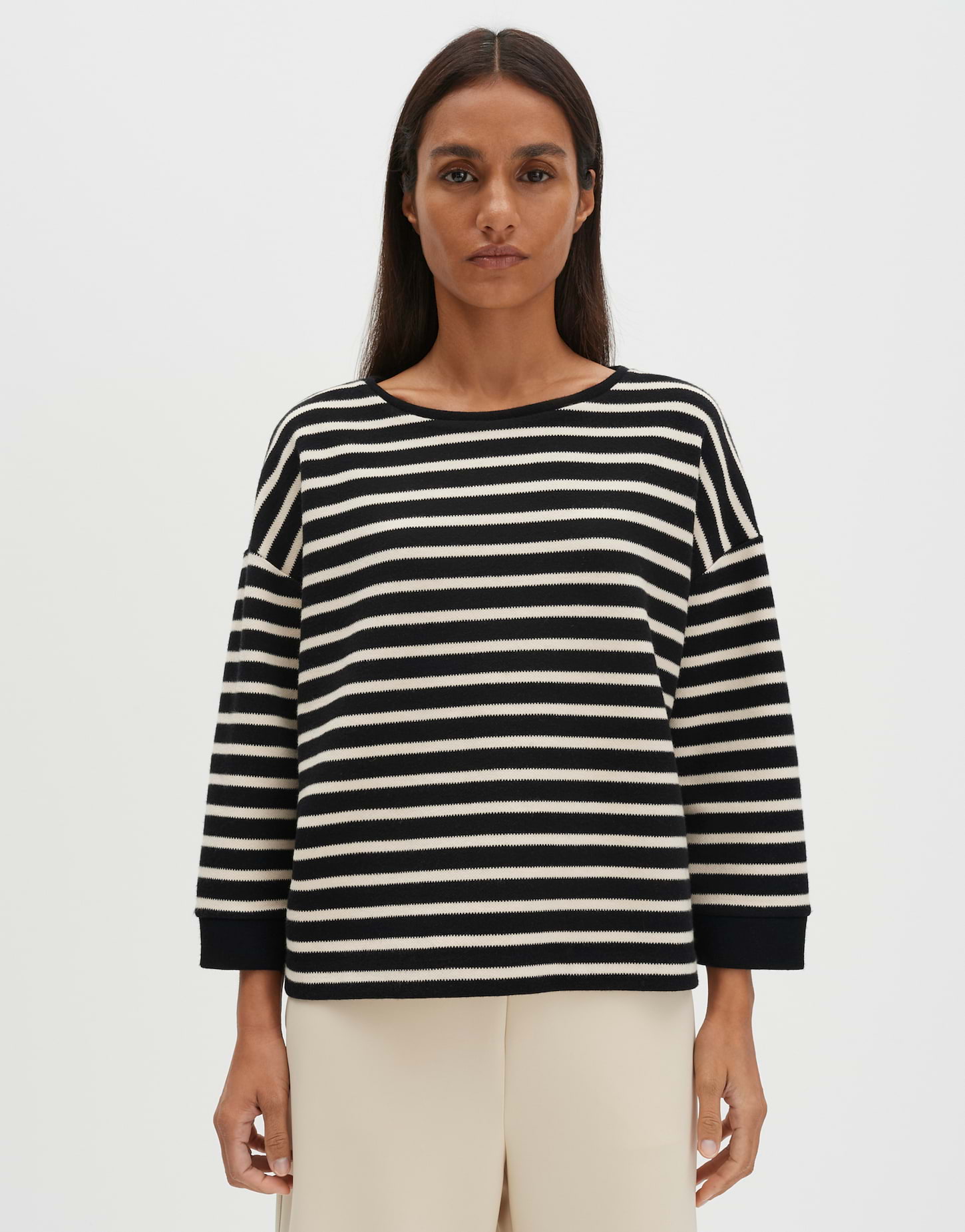 weite Passform, gerader Schnitt, leicht verkürzt geschnitten, überschnittene Schulter mit 3/4 Arm, Rundhalsausschnitt, Rückenlänge ca. 56 cm bei Größe 36, Model Größe 174 cm - trägt Größe 36, Sweatware, weicher Griff, leicht elastischer Stoff, Strick Optik, Streifenmuster, elastischer Rippbund
