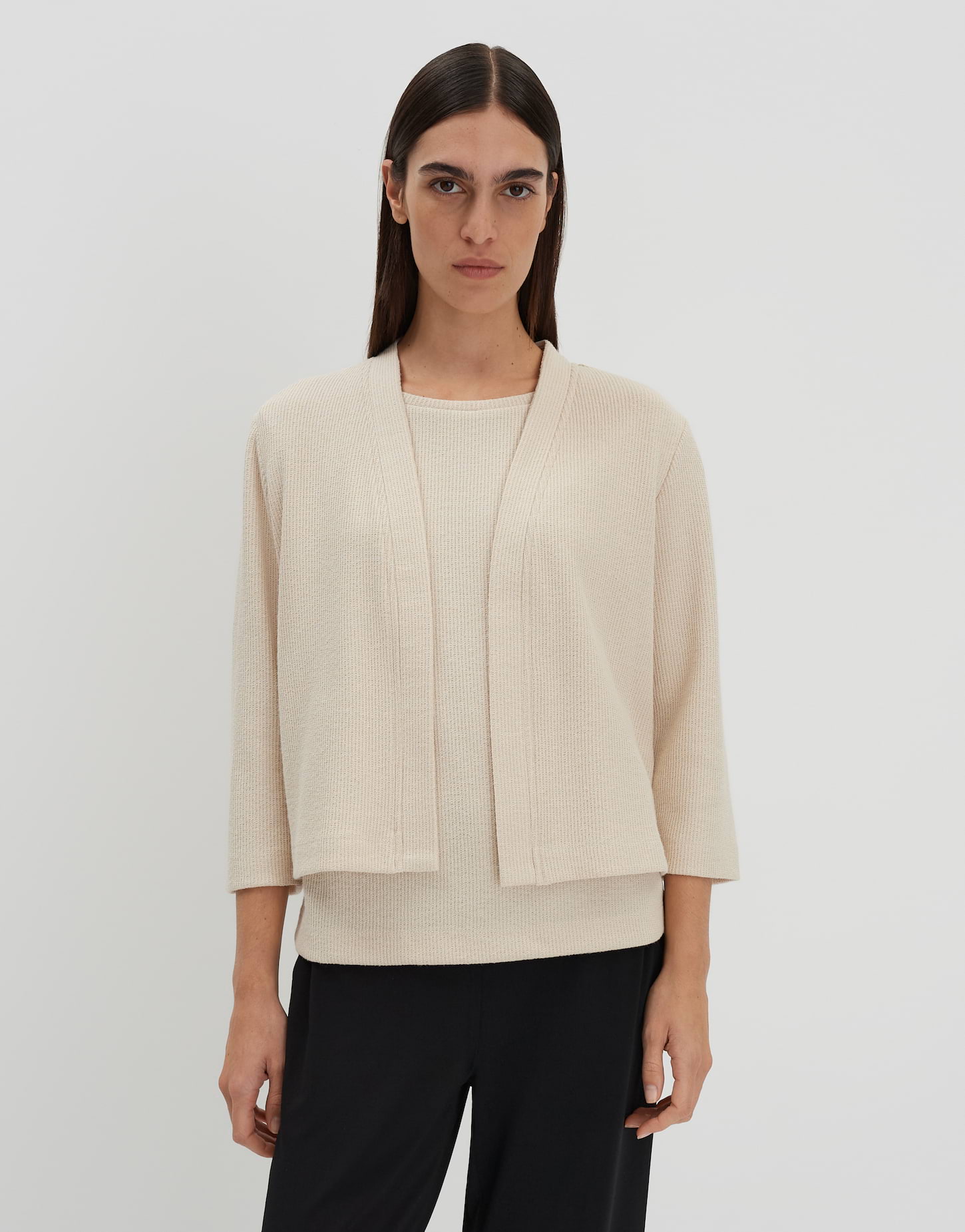 lockere Passform, gerader Schnitt, verkürzte Länge, 3/4 Arm, Rückenlänge ca. 54 cm bei Größe 36, Model Größe 176 cm - trägt Größe 36, Sweatware, feine Rippstruktur, weicher Griff, elastischer Stoff, weich fließender Fall, offene Front