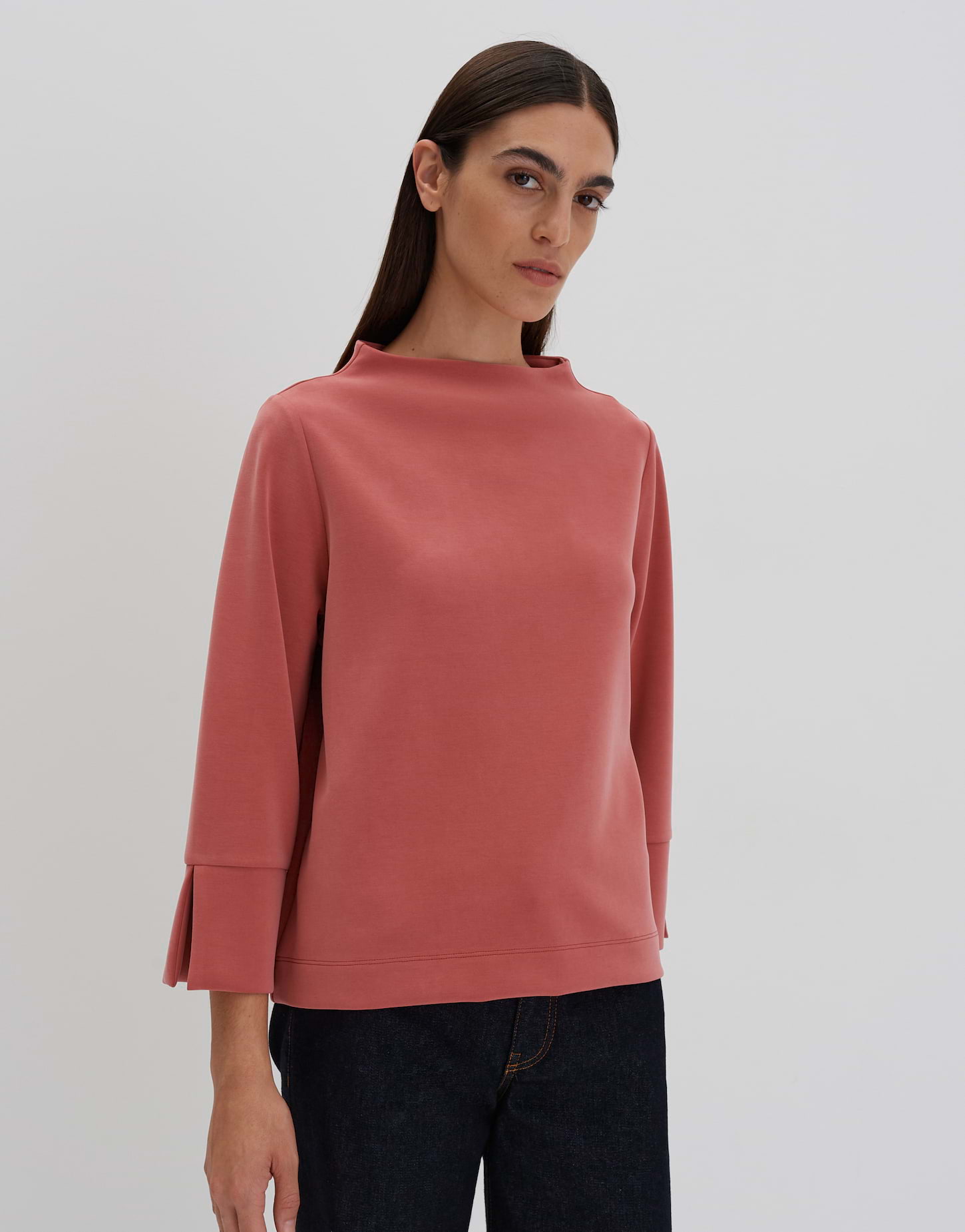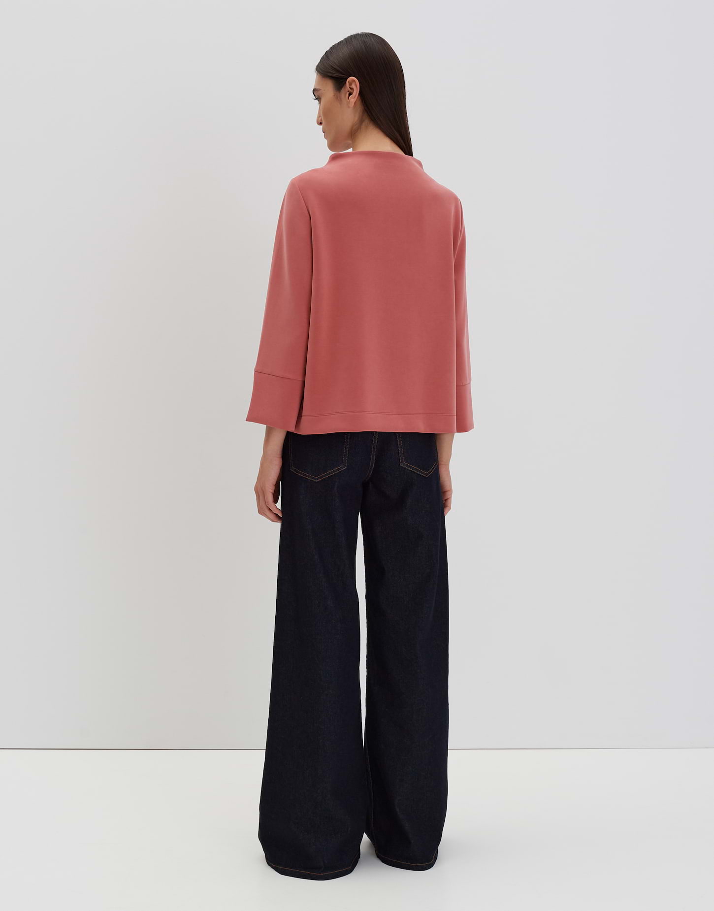 weite Passform, gerader Schnitt, normale Länge, 3/4 Arm, Stehkragen, Rückenlänge ca. 55 cm in Größe 36, Model Größe 177 cm - trägt Größe 36, Sweatware, extrem weicher Griff, samtige Oberfläche, Schlitze im Ärmelbund