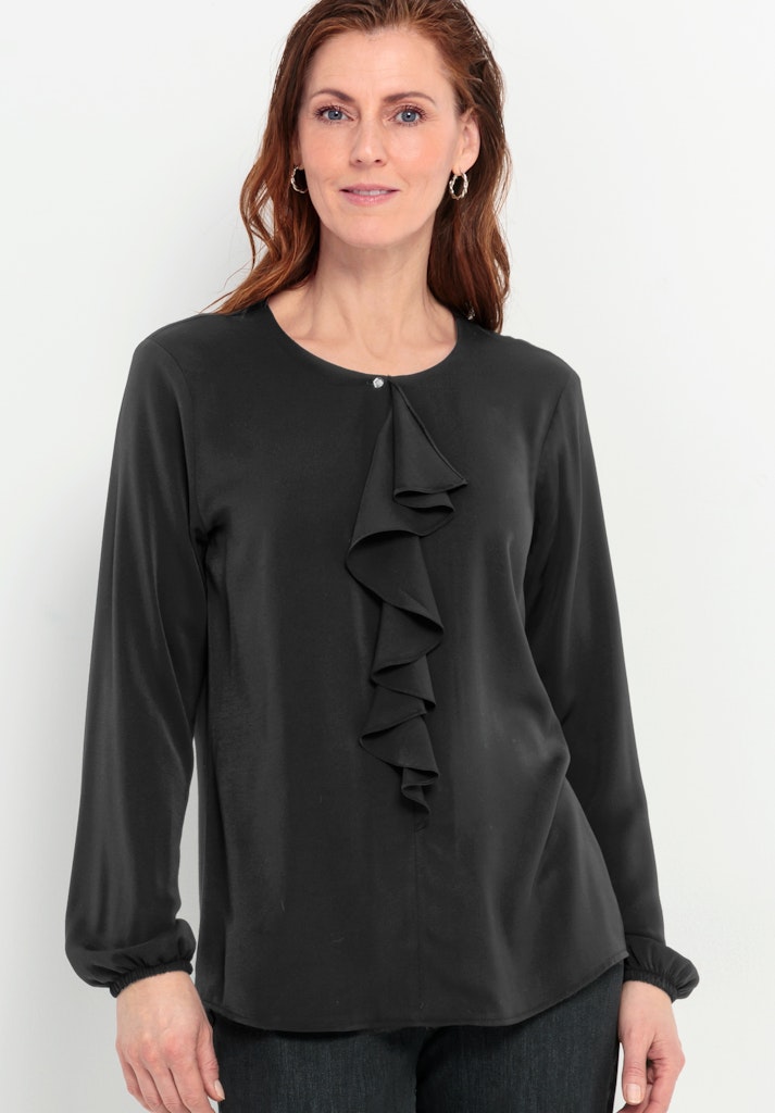 Unsere elegante Langarmbluse Vianna zeigt sich in klassischem Schwarz mit feinem Volantdetail. Der Rundhalsausschnitt mit kleinem Knopfverschluss, die langen Ärmel mit Gummibund und kleine Saumschlitze unterstreichen den modernen Look. Gefertigt aus einem hochwertigen, pflegeleichten Materialmix, trägt sich Vianna angenehm und ist vielseitig kombinierbar, ob zu Jeans in der Freizeit oder zu Business-Outfits für einen stilvollen Auftritt.