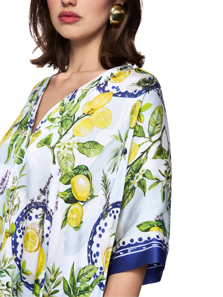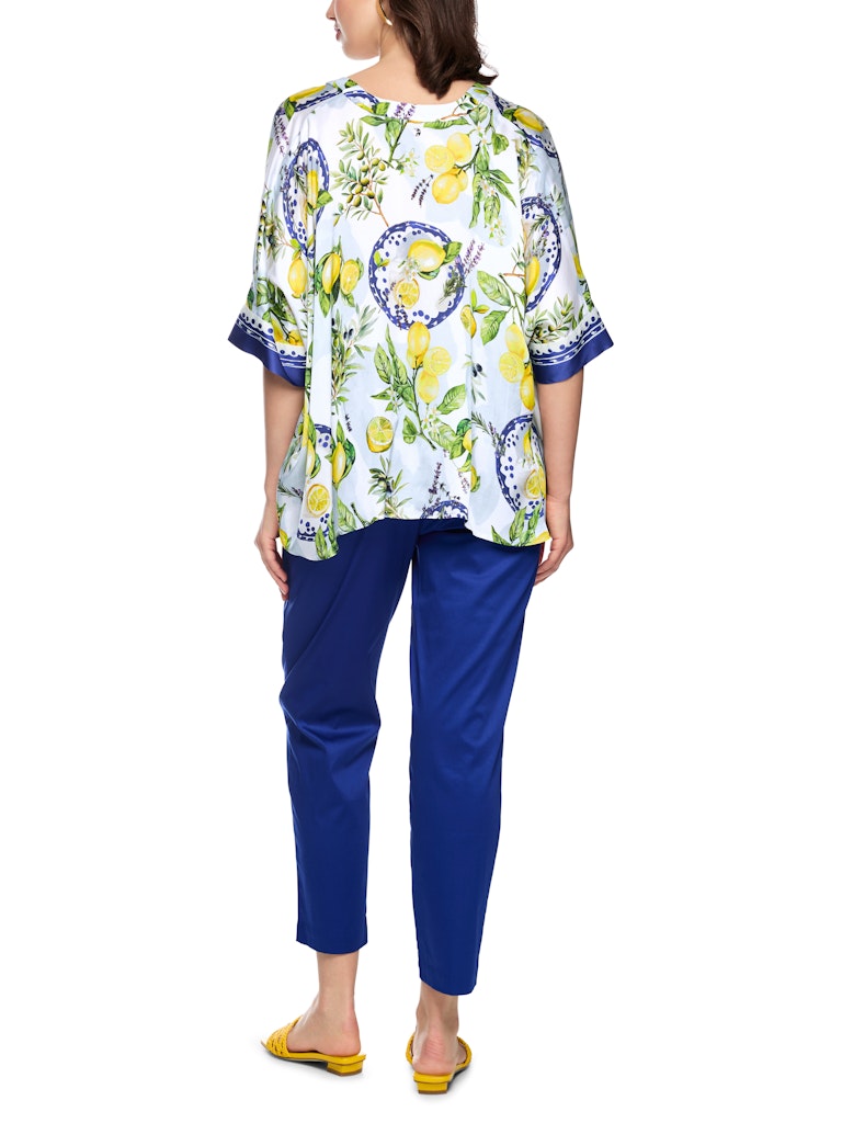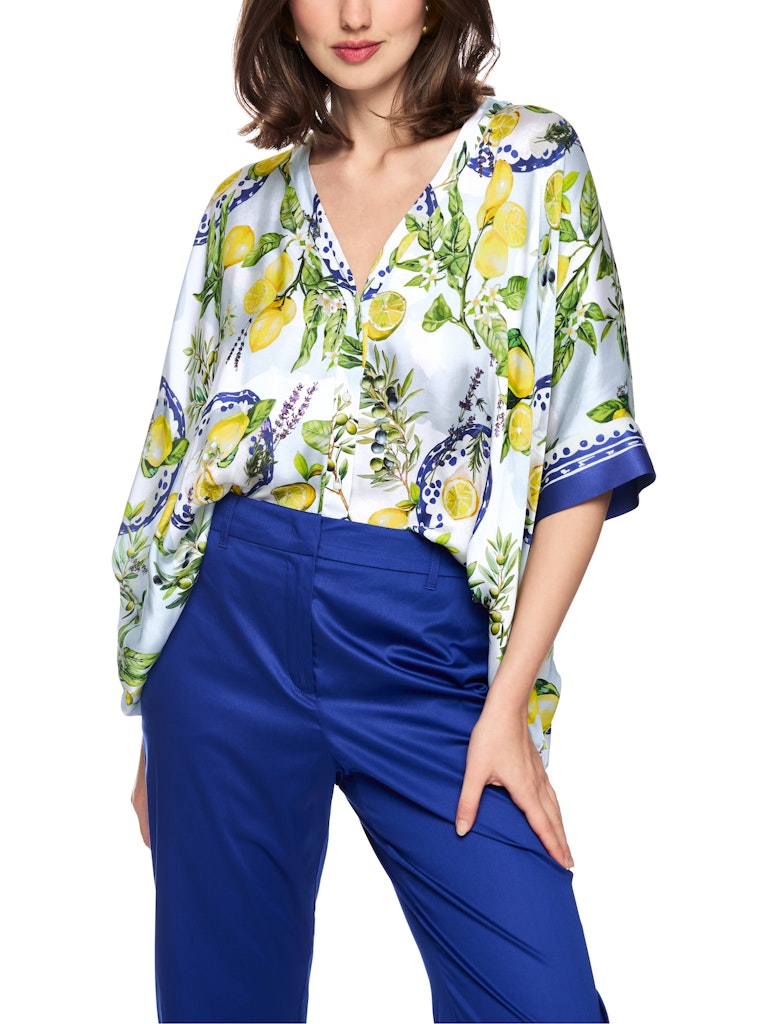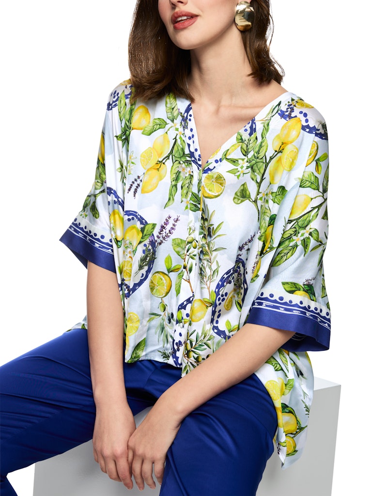 Viskosebluse mit mediterranem Print|Weit geschnittene Bluse aus reiner, fließender Viskose mit angenehm leichtem Fall. Der mediterrane Print mit Zitronen und Oliven macht sie zum absoluten Blickfang und verleiht sommerliches Flair. Dreiviertellange Ärmel, V-Ausschnitt und durchgehende Knopfleiste mit Schmuckknöpfen unterstreichen den femininen Look.|Weit geschnitten|V-Ausschnitt|3/4 Ärmel|Knopfleiste|Das Model ist 179 cm groß und trägt N3/38.