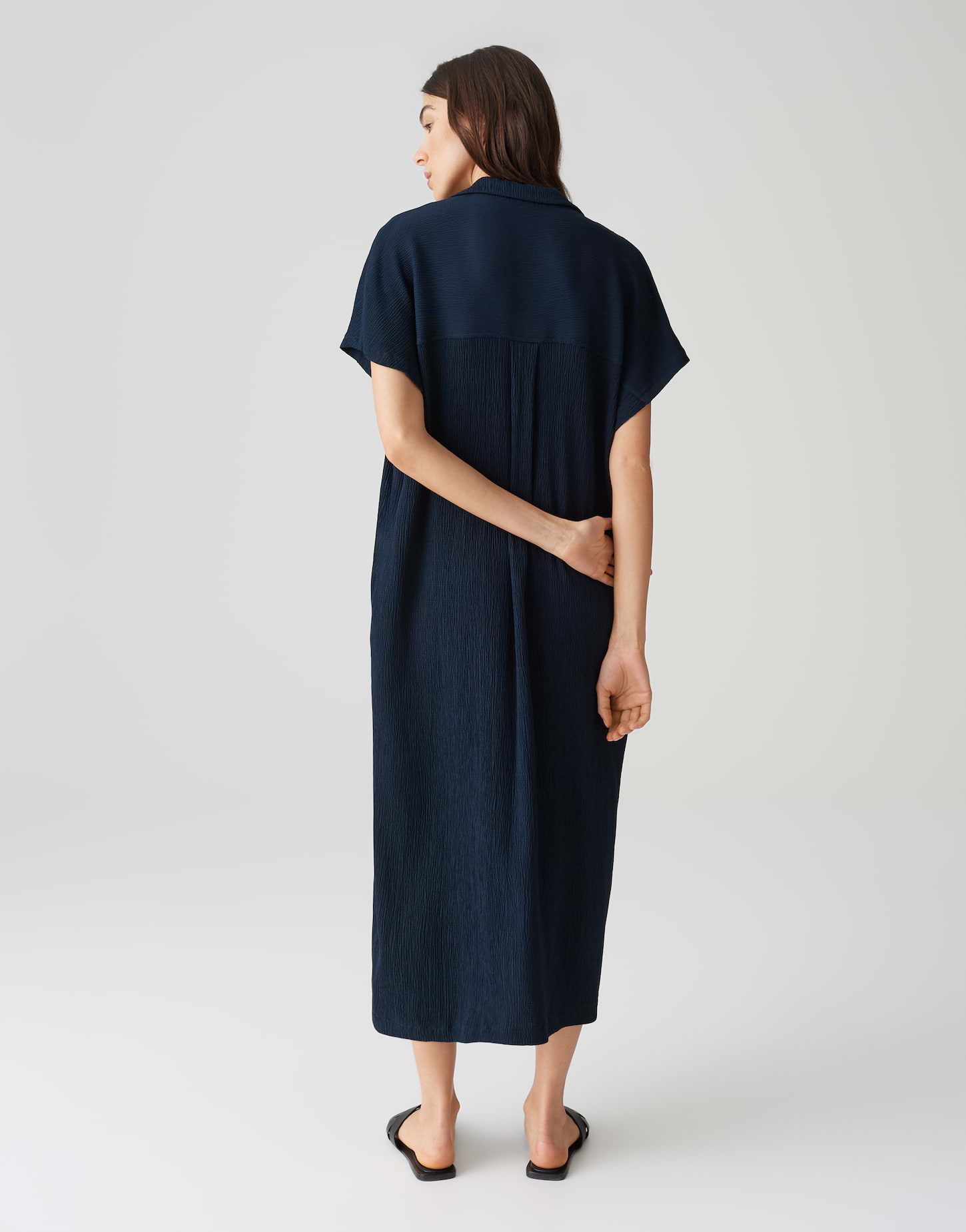 lockere Passform, gerader Schnitt, Midi-Länge, überschnittener Kurzarm, V-Ausschnitt, Umlegekragen, Rückenlänge ca. 120 cm bei Größe 36, Model Größe 175 cm - trägt Größe 36, Webware, Crinkle Optik, weicher Griff, weich fließender Fall, elastischer Stoff, Passe im Rücken, Quetschfalte im Rücken