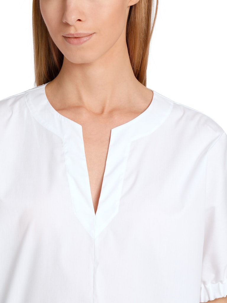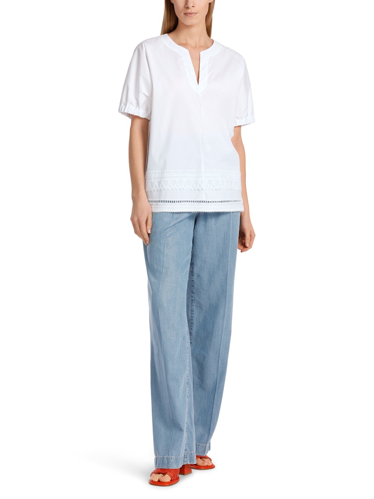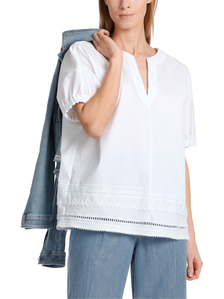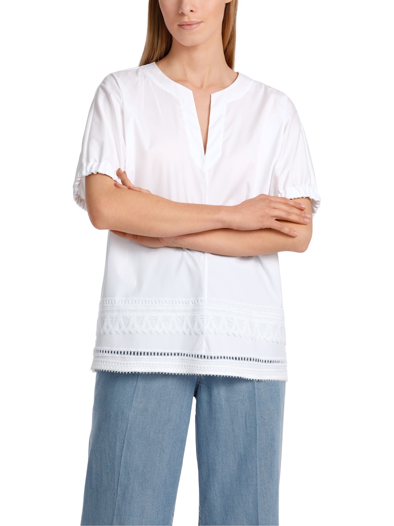 Weite Bluse mit Spitzendetails|Bluse mit A-Shape und angedeutetem Kimonoärmel. Die Ärmelweite ist im Saum mit einem Gummibund reduziert. Den Saum zieren zwei Spitzenbordüren und Lochstickerei. Die Halslösung besteht aus Rundhals und Schlitz. Ein cooler und unkomplizierter Staple für die festliche Sommergarderobe.|A-Linie|Rundhals|Made in Europe|Spitze und Stickerei|Das Model ist 179 cm groß und trägt N3/38.