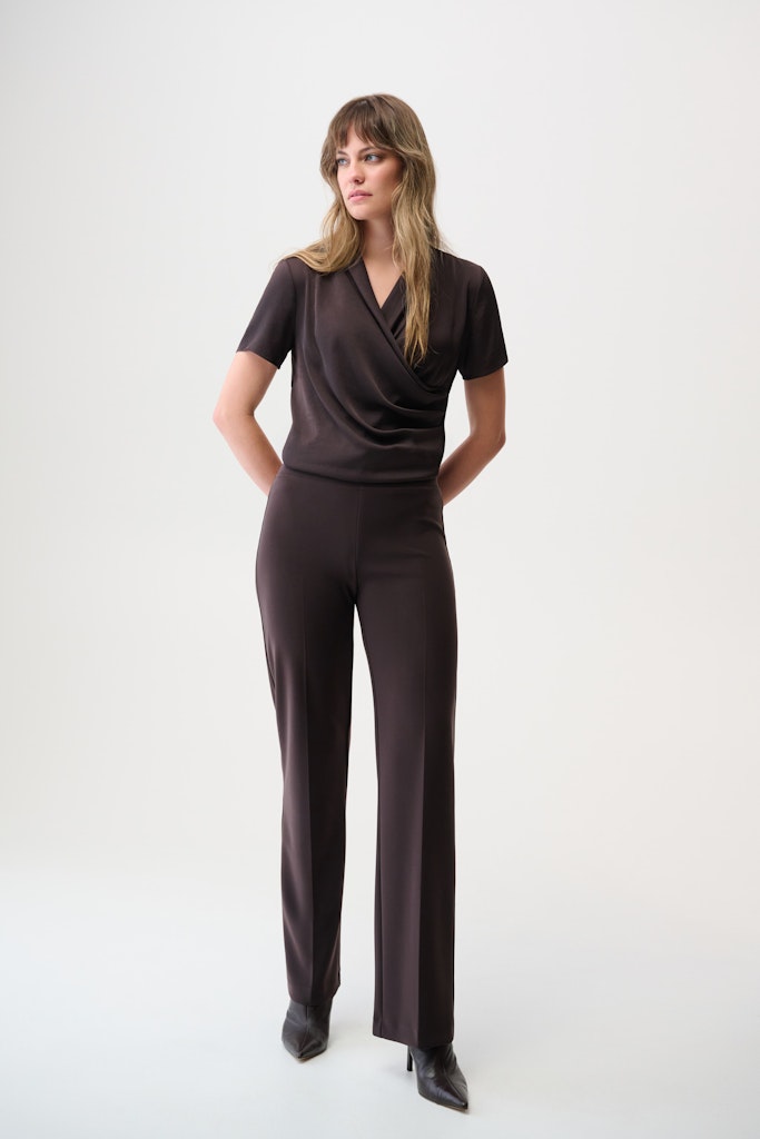 Die weit geschnittene Jerseyhose mit dezent höherem Bund verlängert optisch das Bein. Eine eingesteckte Bluse und High Heels verstärken den Effekt. Komfortbund, feminine Silhouette.