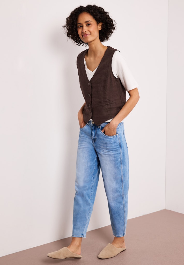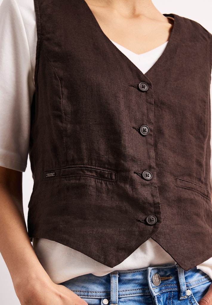 Die kurze Leinenweste von Street One für Damen ist ideal für einen luftigen, sommerlichen Look. Die reine Leinenqualität sorgt für ein angenehm leichtes Tragegefühl. V-Ausschnitt, Knopfleiste und angedeutete Taschen verleihen der Weste eine feminine, cleane Optik. Perfekt zum Layern über anderen Oberteilen an warmen Tagen. Kurze Weste Casual V-Ausschnitt Knopfleiste Sommerlicher Look Material: 100% Leinen