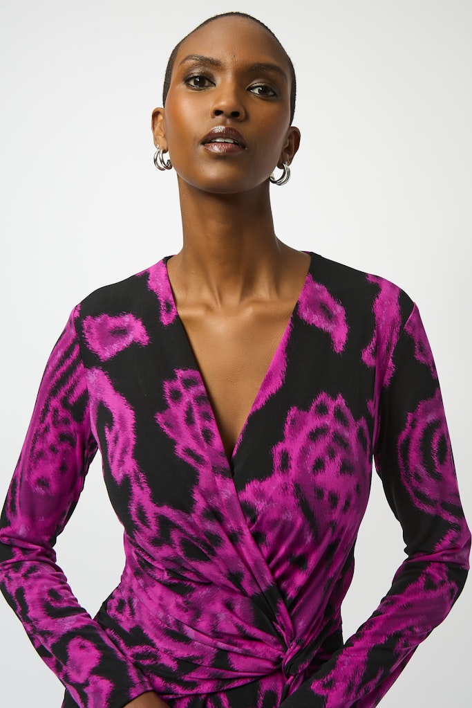 Romantik und Glamour in perfekter Harmonie. Dieses bemerkenswerte Kleid aus feinem Jersey präsentiert ein atemberaubendes Paisleymuster, das durch sein feminines Flair besticht. Der schicke Wickelausschnitt und die vordere Taillenpasse mit zarten Drapierungen schaffen eine exquisite Silhouette, die das Etuikleid-Design aufwertet. Das Kleidungsstück fällt anmutig unterhalb des Knies und verleiht jedem Schritt Eleganz.