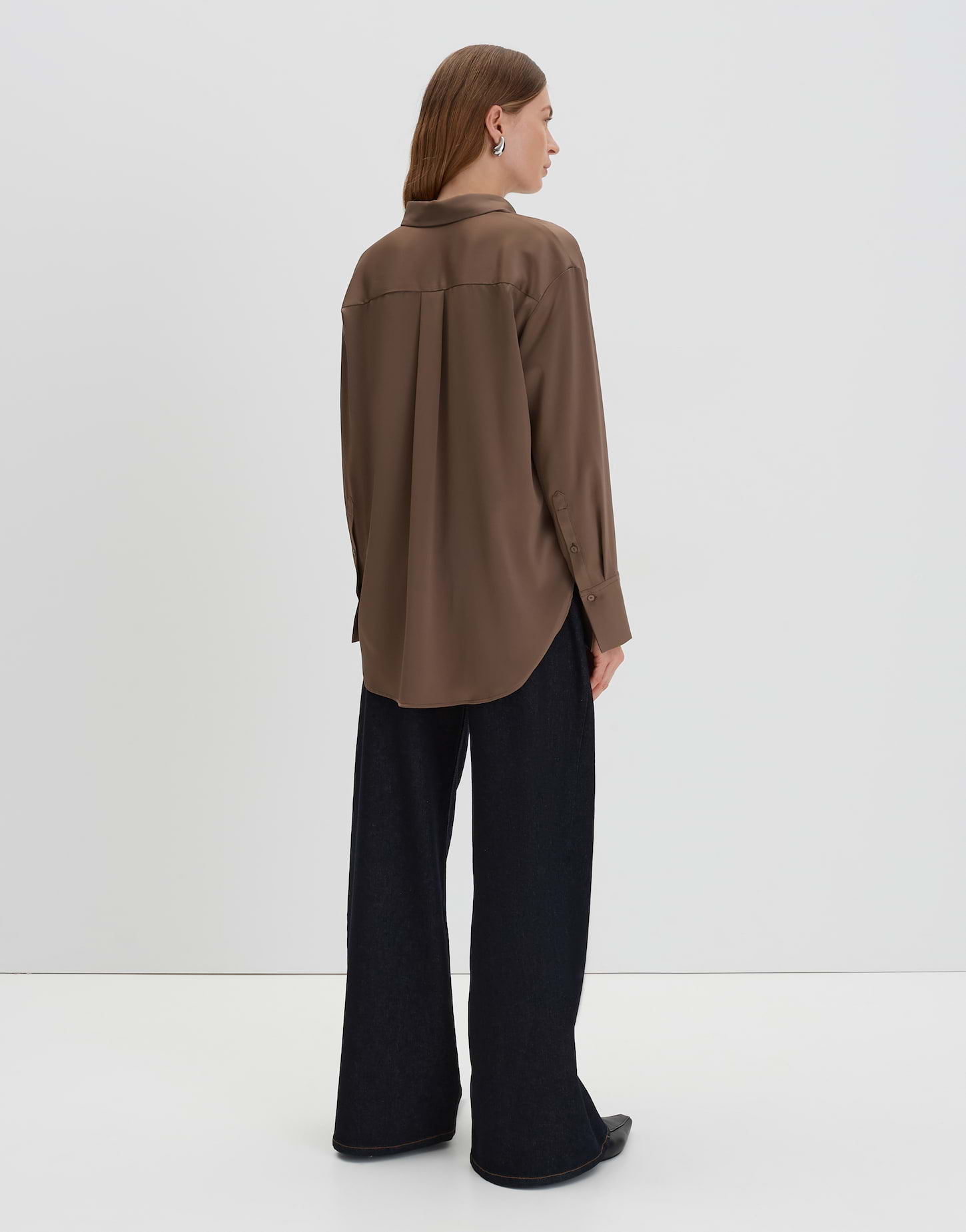 Polokragen und V-Ausschnitt, abgerundeter Saum, klasssischer Kragen, Rückenlänge ca. 76 cm bei Größe 36, Model Größe 180 cm - trägt Größe 36, Recycled Polyester Mix, schwere Ware, glänzende Oberfläche, Passe im Rücken, klassische Manschetten, Kellerfalte im Rücken , hinten länger als vorne