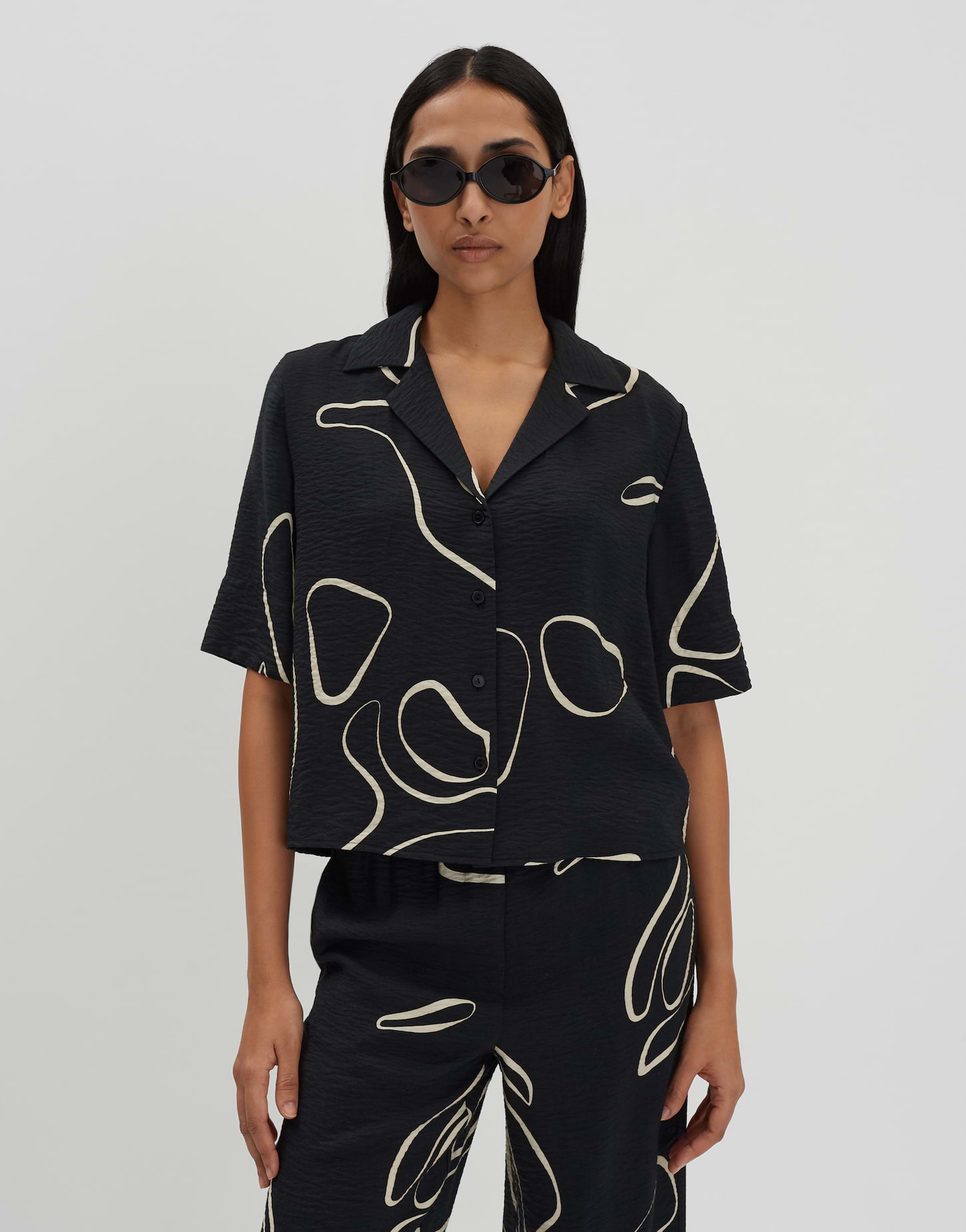 weite Passform, Boxy Silhouette, verkürzte Länge, Halbarm, Resortkragen, Rückenlänge ca. 55 cm bei Größe 36, Model Größe 176 cm - trägt Größe 36, Webware, leichte Crash Optik, weicher Griff, fließender Fall, abstrakter Print, kleine Falten unter der Passe