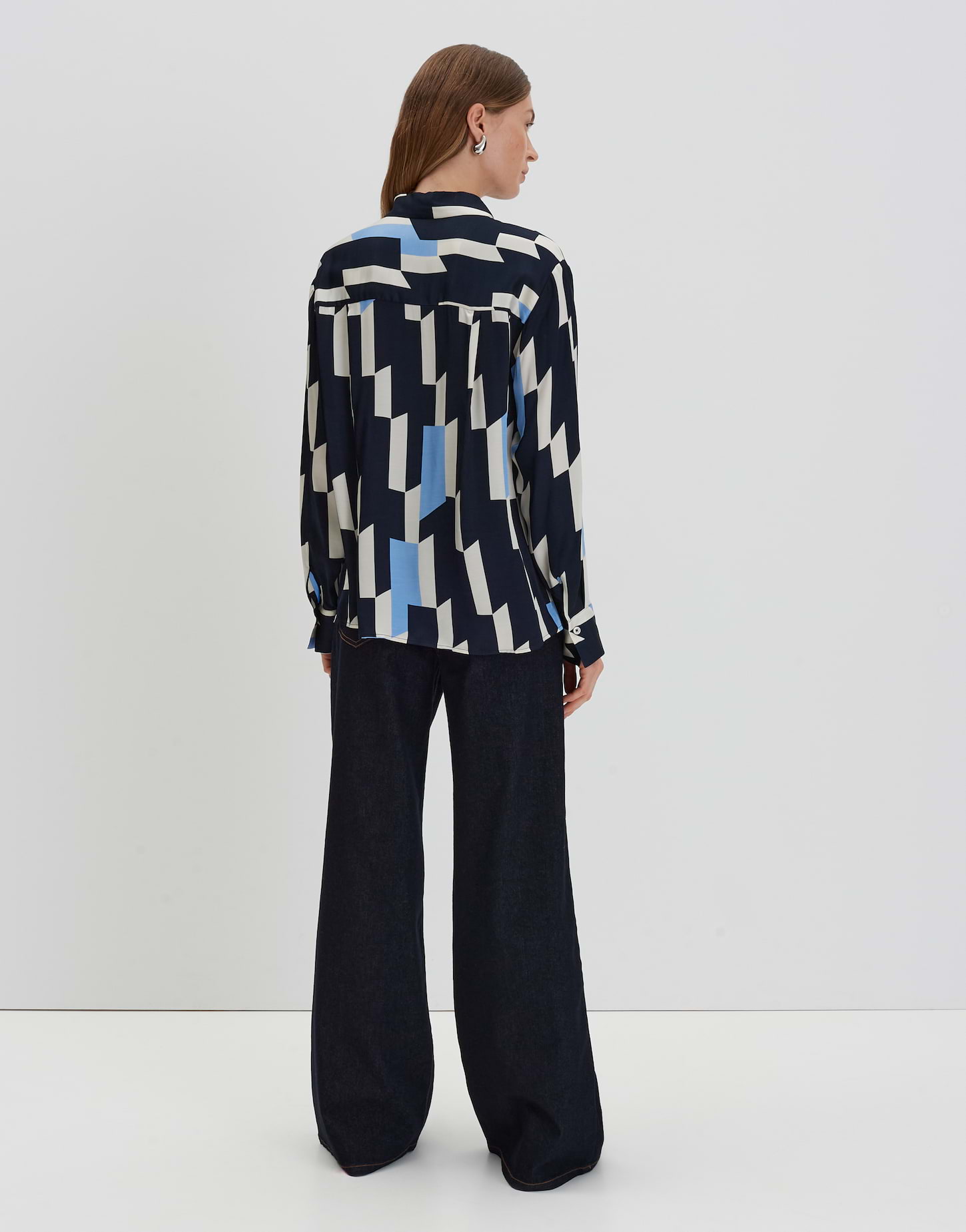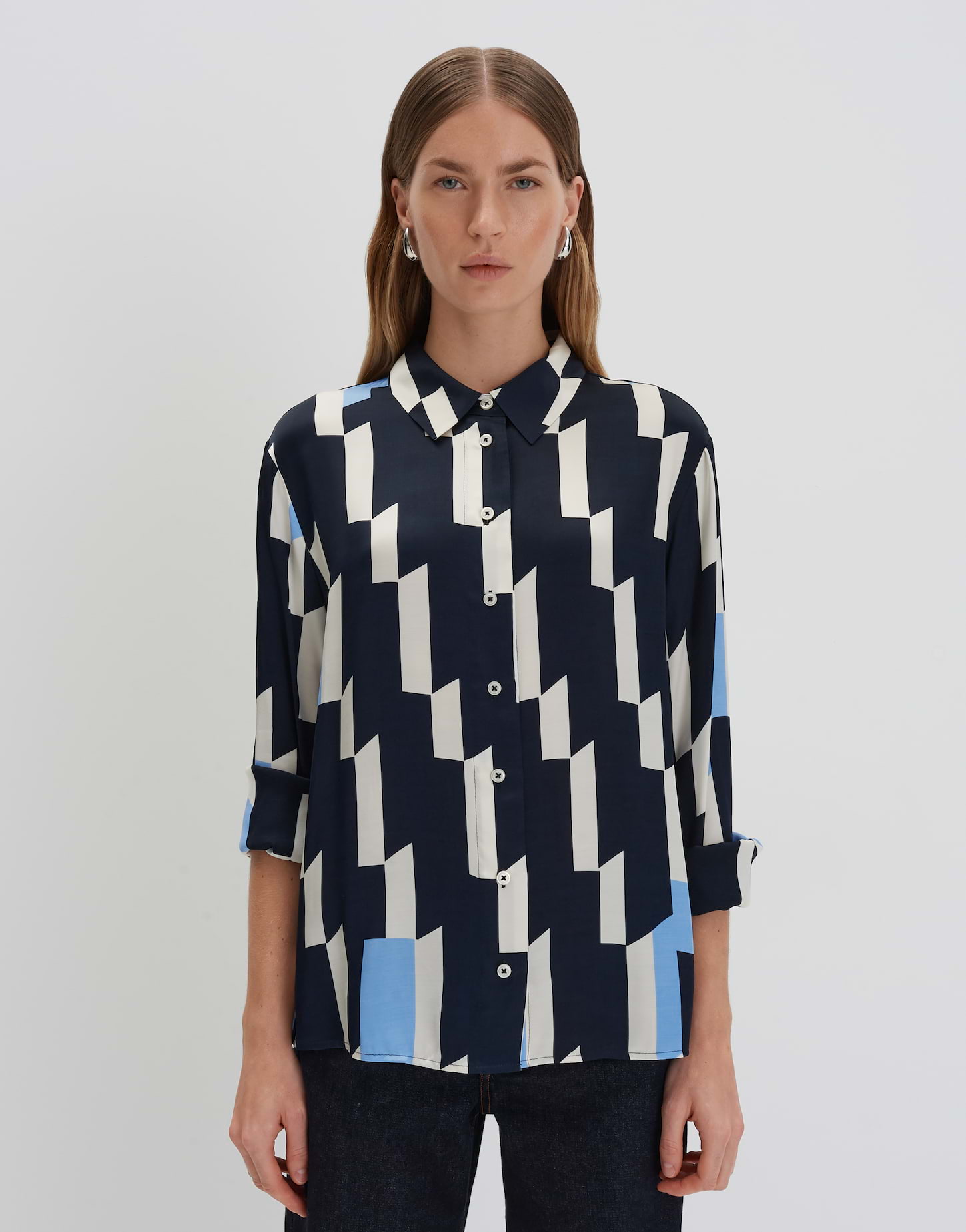 oversized Passform, gerader Schnitt, lang geschnitten, überschnittene Schulter mit Langarm, klassischer Kragen, Rückenlänge ca. 67 cm in Größe 36, Model Größe 177 cm - trägt Größe 36, Satin, weicher Griff, fließender Fall, dezenter Schimmer, grafisches Muster, Falten im Rücken, lange Knopfleiste, Schlitze in den Seiten, klassische Manschetten