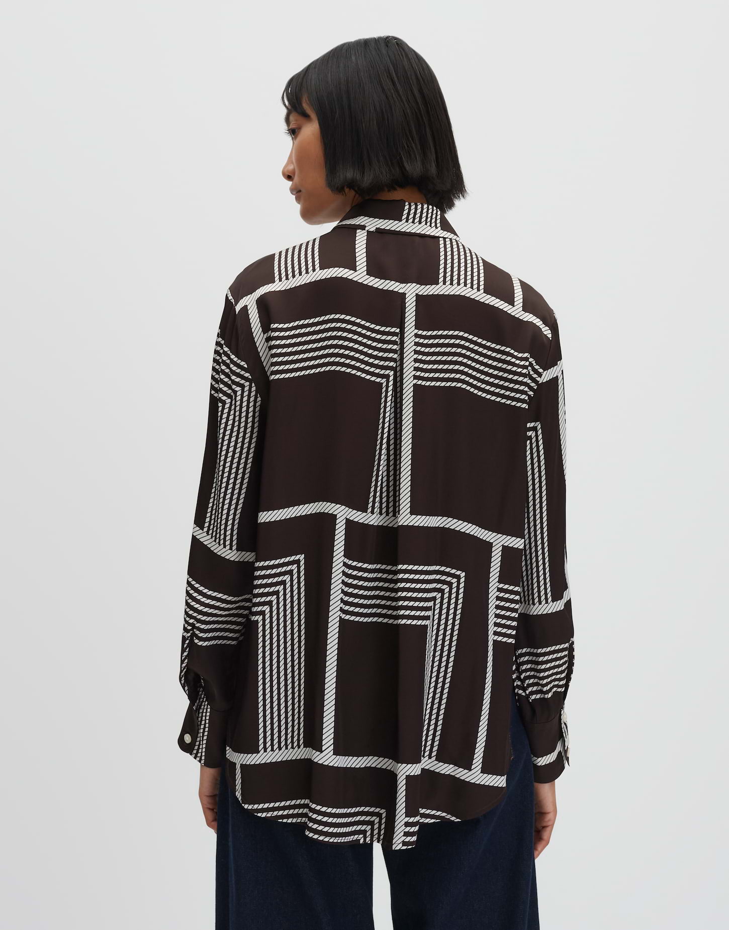 lockere Passform, leicht ausgestellt geschnitten, lang geschnitten, Langarm, Rückenlänge ca. 73 cm bei Größe 36, Model Größe 176 cm - trägt Größe 36, Satin, glatter Griff, weich fließender Fall, dezenter Schimmer, All-Over-Print, Kellerfalte im Rücken, abgerundeter Saum, verdeckte Knopfleiste, klassische Manschetten