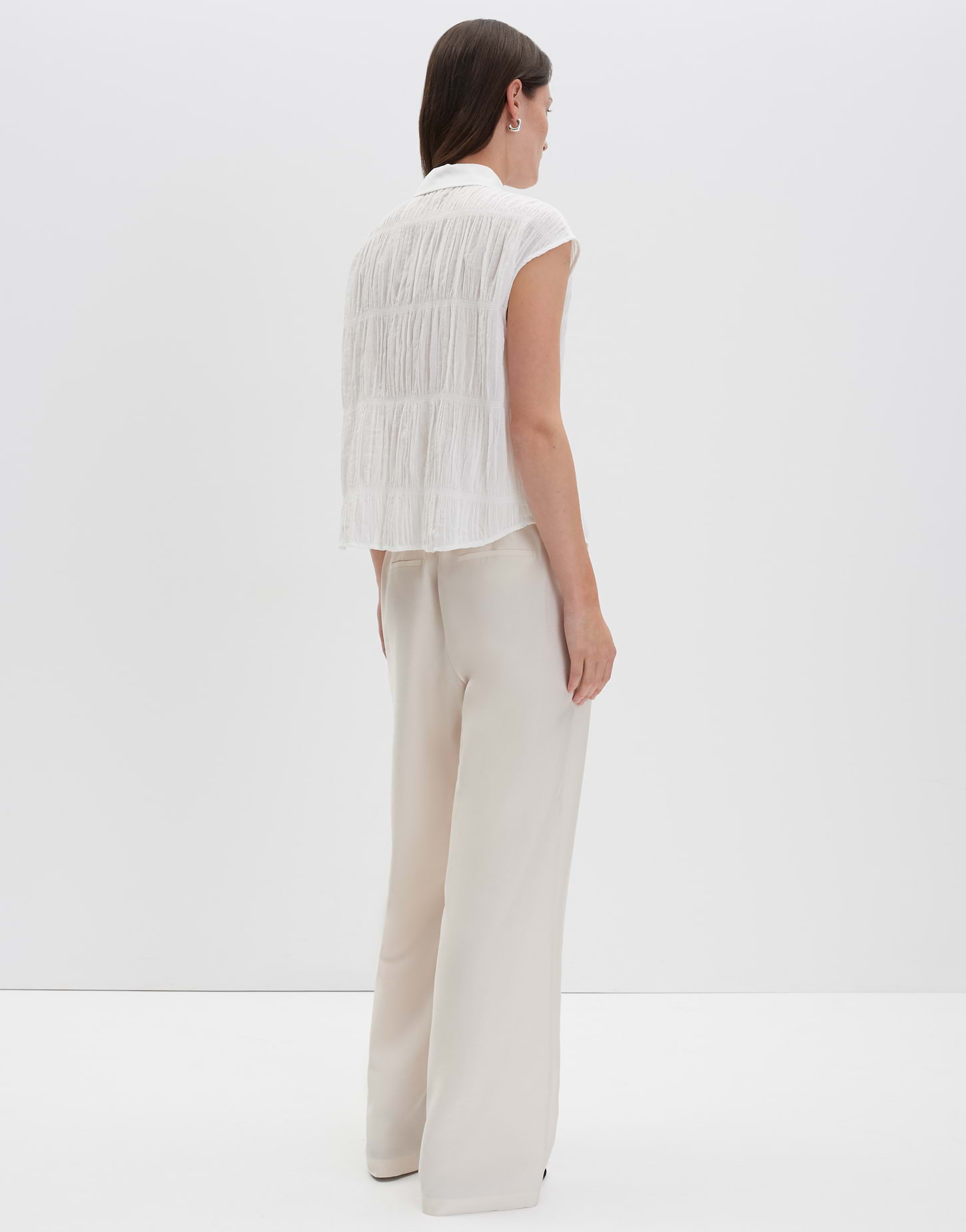 normale Passform, figurbetont geschnitten, leicht verkürzt geschnitten, überschnittener Kurzarm, Hemdblusenkragen, Rückenlänge ca. 58 cm bei Größe 36, Model Größe 177 cm - trägt Größe 36, Webware, enthält nichttextile Teile tierischen Ursprungs, plissierte Struktur, leichter Stoff, leichte Transparenz, Knopfleiste vorn, Perlmuttknöpfe