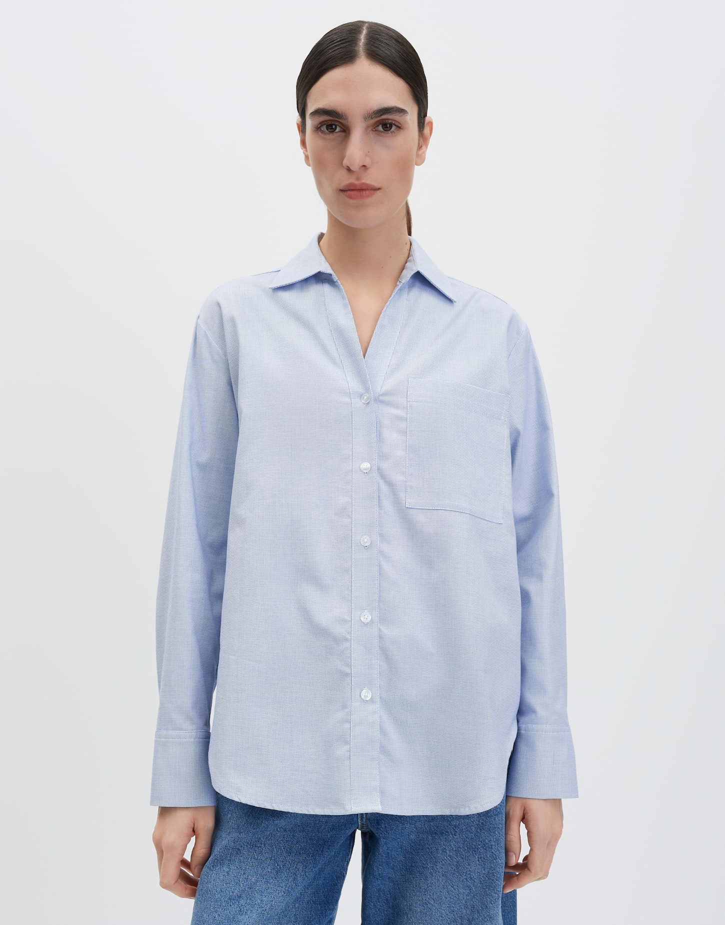 lockere Passform, gerader Schnitt, überschnittene Schulter mit Langarm, V-Ausschnitt, Hemdblusenkragen, Rückenlänge ca. 72 cm bei Größe 36, Model Größe 176 cm - trägt Größe 36, Webware, dezente Struktur, weicher Griff, formstabil, zweifarbiges Muster, aufgesetzte Tasche, Kellerfalte im Rücken, abgerundeter Saum, Knopfleiste